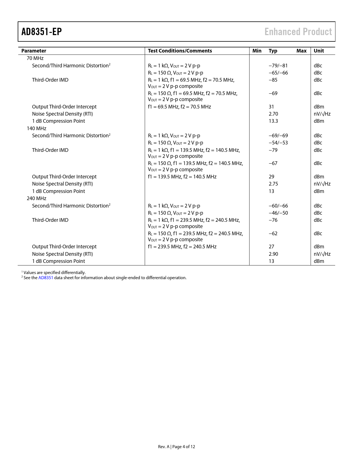 | Pages / Page | 12 / 4 — AD8351-EP. Enhanced Product. Parameter. Test Conditions/Comments. Min … |