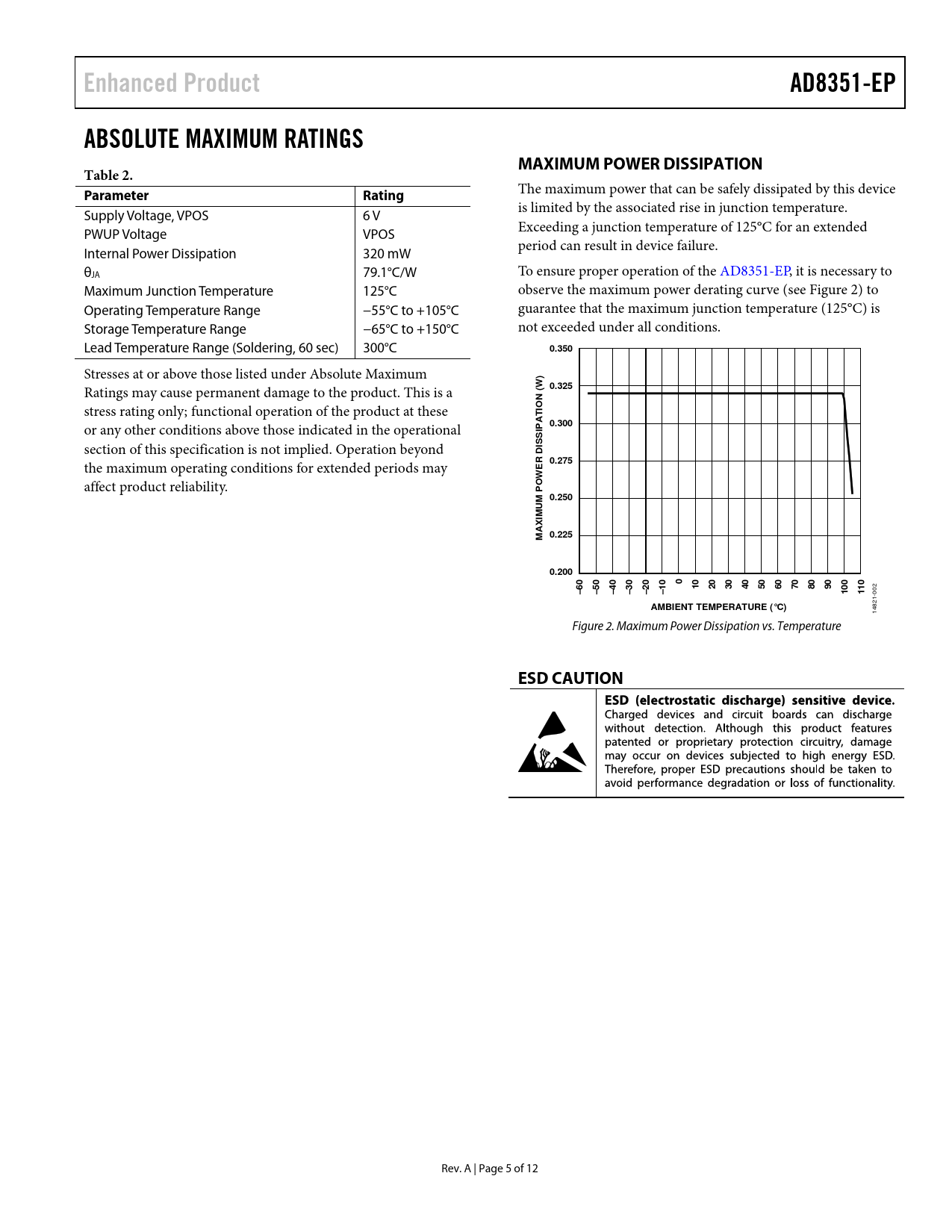 link to page 5 Enhanced ProductAD8351-EPABSOLUTE MAXIMUM RATINGSMAXIMUM POWER DISSIPATIONTable 2. ParameterRating The maximum power that can be safely dissipated by this device Supply Voltage, VPOS 6 V is limited by the associated rise in junction temperature. PWUP Voltage VPOS Exceeding a junction temperature of 125°C for an extended Internal Power Dissipation 320 mW period can result in device failure. θJA 79.1°C/W To ensure proper operation of the AD8351-EP, it is necessary to Maximum Junction Temperature 125°C observe the maximum power derating curve (see Figure 2) to Operating Temperature Range −55°C to +105°C guarantee that the maximum junction temperature (125°C) is Storage Temperature Range −65°C to +150°C not exceeded under all conditions. Lead Temperature Range (Soldering, 60 sec) 300°C 0.350 Stresses at or above those listed under Absolute Maximum ) Ratings may cause permanent damage to the product. This is a 0.325(W N stress rating only; functional operation of the product at these IO T or any other conditions above those indicated in the operational 0.300PA section of this specification is not implied. Operation beyond ISSI D the maximum operating conditions for extended periods may 0.275ER W affect product reliability. 0.250M POMU XI0.225MA0.2000102030405060708090–60–50–40–30–20–10100110 002 AMBIENT TEMPERATURE (°C) 14821- Figure 2. Maximum Power Dissipation vs. Temperature ESD CAUTION Rev. A | Page 5 of 12 Document Outline FEATURES ENHANCED PRODUCT FEATURES APPLICATIONS FUNCTIONAL BLOCK DIAGRAM GENERAL DESCRIPTION REVISION HISTORY SPECIFICATIONS ABSOLUTE MAXIMUM RATINGS MAXIMUM POWER DISSIPATION ESD CAUTION PIN CONFIGURATION AND FUNCTION DESCRIPTIONS TYPICAL PERFORMANCE CHARACTERISTICS OUTLINE DIMENSIONS ORDERING GUIDE