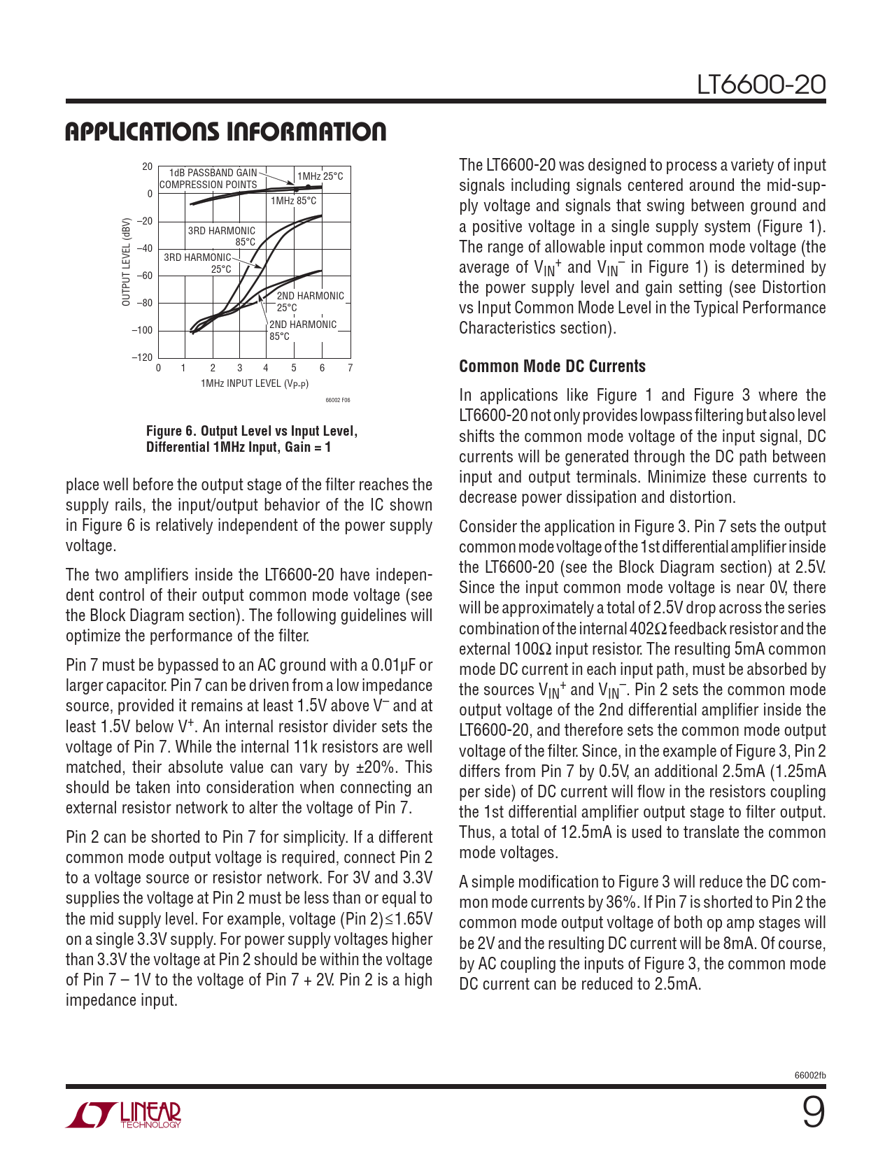1MHz INPUT LEVEL (VP-P) 66002 F06 In applications like Figure 1 and Figure 3 where the LT6600-20 not only provides lowpass fi ltering but also level