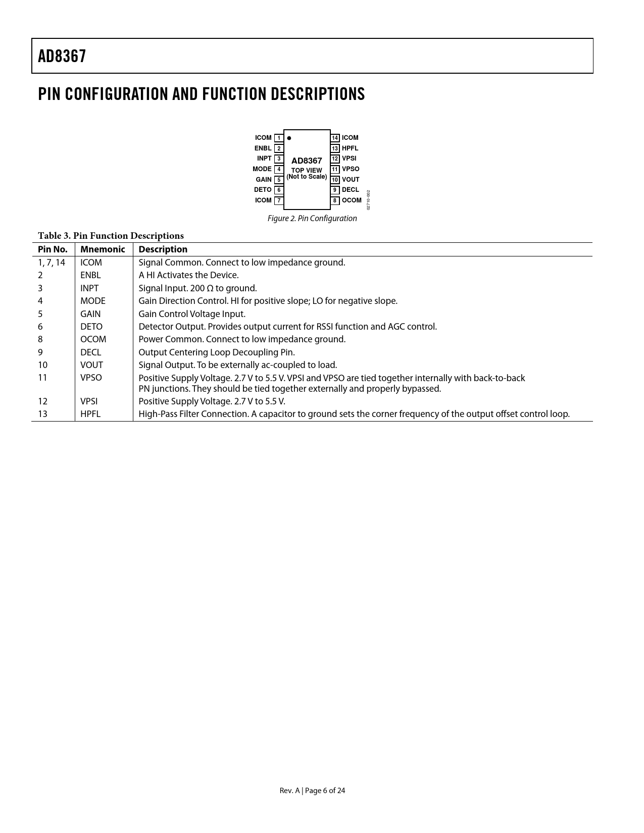 AD8367PIN CONFIGURATION AND FUNCTION DESCRIPTIONSICOM114 ICOMENBL213 HPFLINPT3AD836712 VPSIMODE4TOP VIEW11 VPSO(Not to Scale)GAIN510 VOUTDETO69DECLICOM78OCOM 02710-002 Figure 2. Pin Configuration Table 3. Pin Function Descriptions Pin No.MnemonicDescription 1, 7, 14 ICOM Signal Common. Connect to low impedance ground. 2 ENBL A HI Activates the Device. 3 INPT Signal Input. 200 Ω to ground. 4 MODE Gain Direction Control. HI for positive slope; LO for negative slope. 5 GAIN Gain Control Voltage Input. 6 DETO Detector Output. Provides output current for RSSI function and AGC control. 8 OCOM Power Common. Connect to low impedance ground. 9 DECL Output Centering Loop Decoupling Pin. 10 VOUT Signal Output. To be externally ac-coupled to load. 11 VPSO Positive Supply Voltage. 2.7 V to 5.5 V. VPSI and VPSO are tied together internally with back-to-back PN junctions. They should be tied together externally and properly bypassed. 12 VPSI Positive Supply Voltage. 2.7 V to 5.5 V. 13 HPFL High-Pass Filter Connection. A capacitor to ground sets the corner frequency of the output offset control loop. Rev. A | Page 6 of 24 Document Outline FEATURES APPLICATIONS FUNCTIONAL BLOCK DIAGRAM GENERAL DESCRIPTION TABLE OF CONTENTS REVISION HISTORY SPECIFICATIONS ABSOLUTE MAXIMUM RATINGS ESD CAUTION PIN CONFIGURATION AND FUNCTION DESCRIPTIONS TYPICAL PERFORMANCE CHARACTERISTICS THEORY OF OPERATION INPUT ATTENUATOR AND GAIN CONTROL INPUT AND OUTPUT INTERFACES POWER AND VOLTAGE METRICS NOISE AND DISTORTION OUTPUT CENTERING RMS DETECTION APPLICATIONS INPUT AND OUTPUT MATCHING VGA OPERATION MODULATED GAIN MODE AGC OPERATION MODIFYING THE AGC SETPOINT EVALUATION BOARD CHARACTERIZATION SETUP AND METHODS OUTLINE DIMENSIONS ORDERING GUIDE