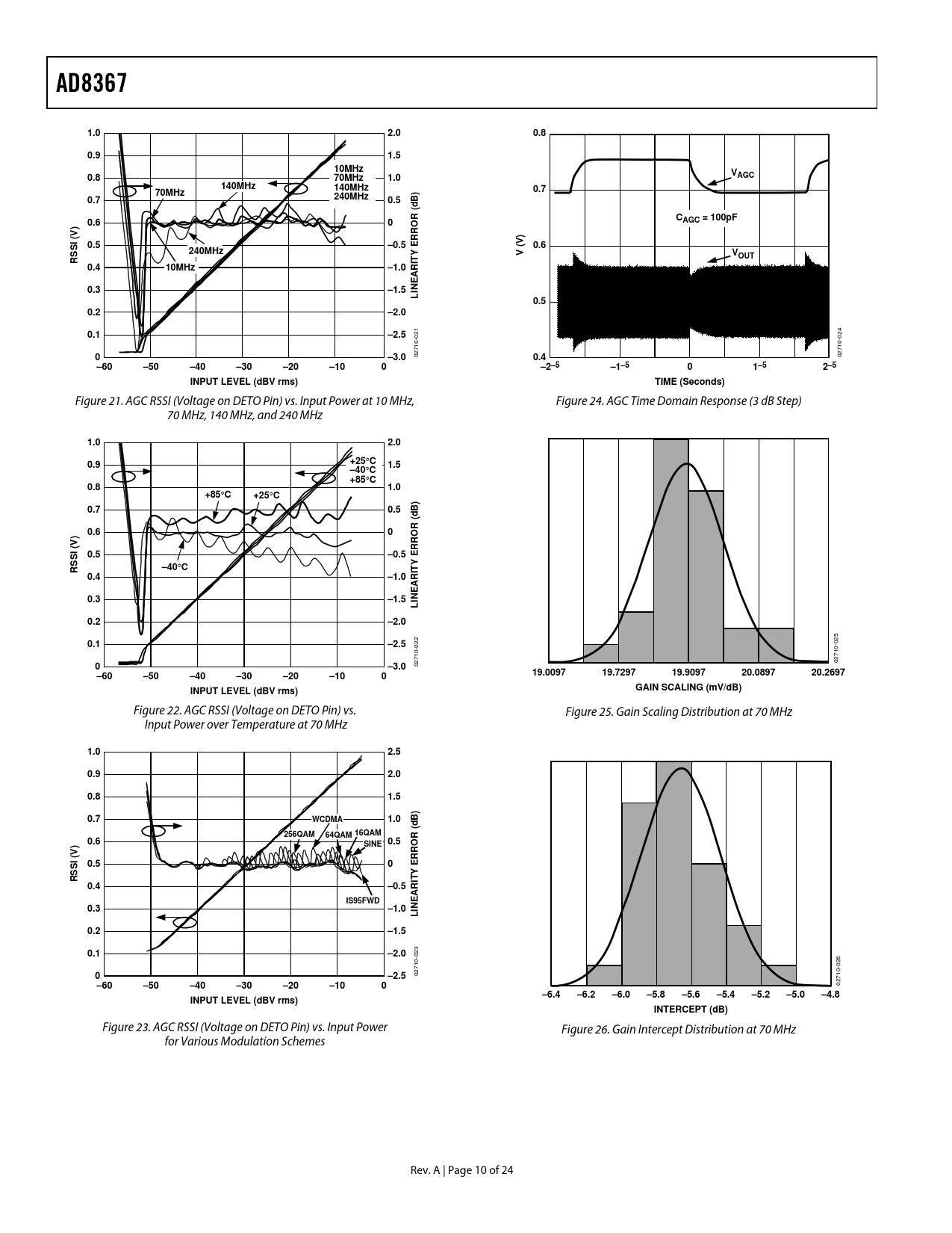 Figure 21. AGC RSSI (Voltage on DETO Pin) vs. Input Power at 10 MHz, Figure 24. AGC Time Domain Response (3 dB Step) 70 MHz, 140 MHz, and 240 MHz