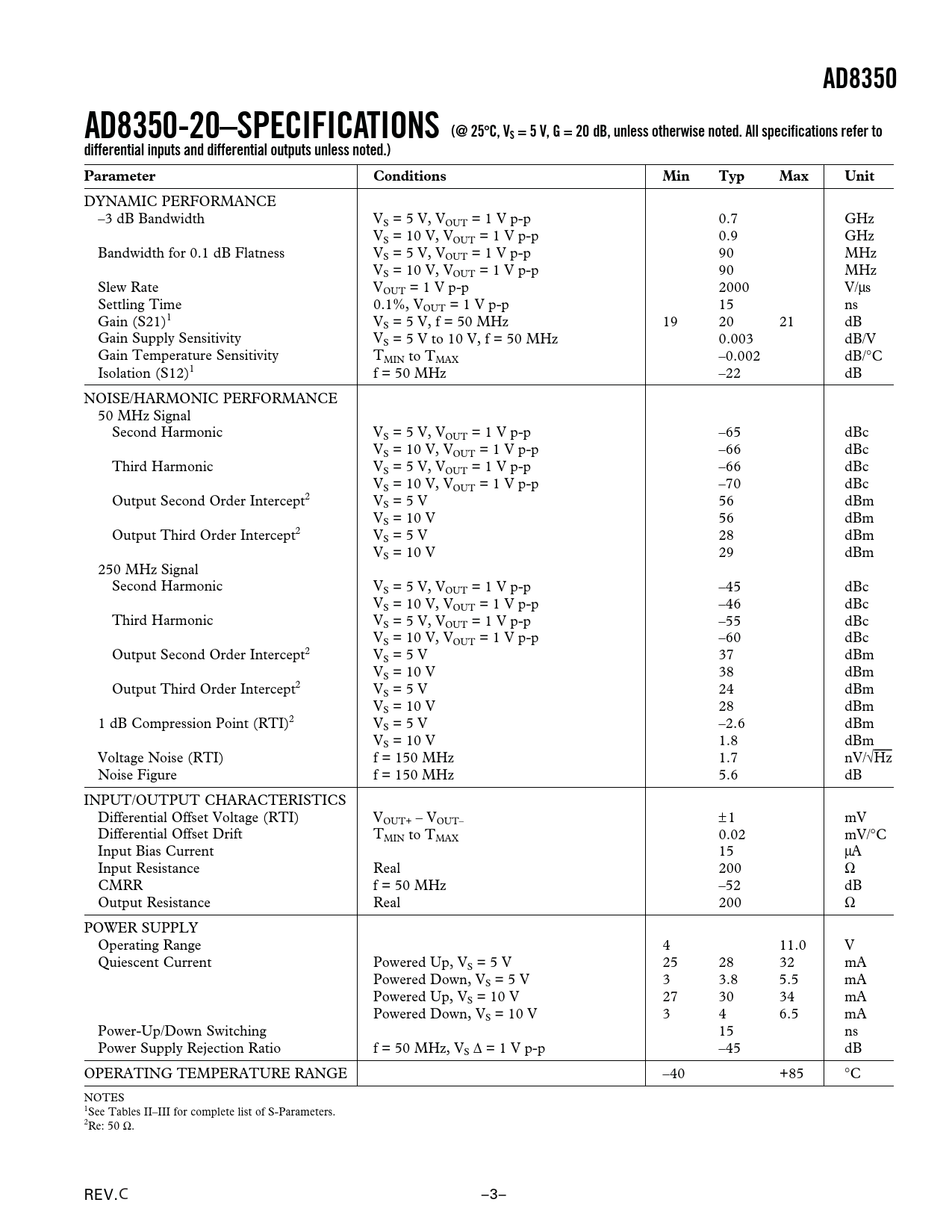 Pages / Page14 / 3 — AD8350. AD8350-20–SPECIFICATIONS (@ 25. C, VS = 5 V, G = 20 dB, unless …