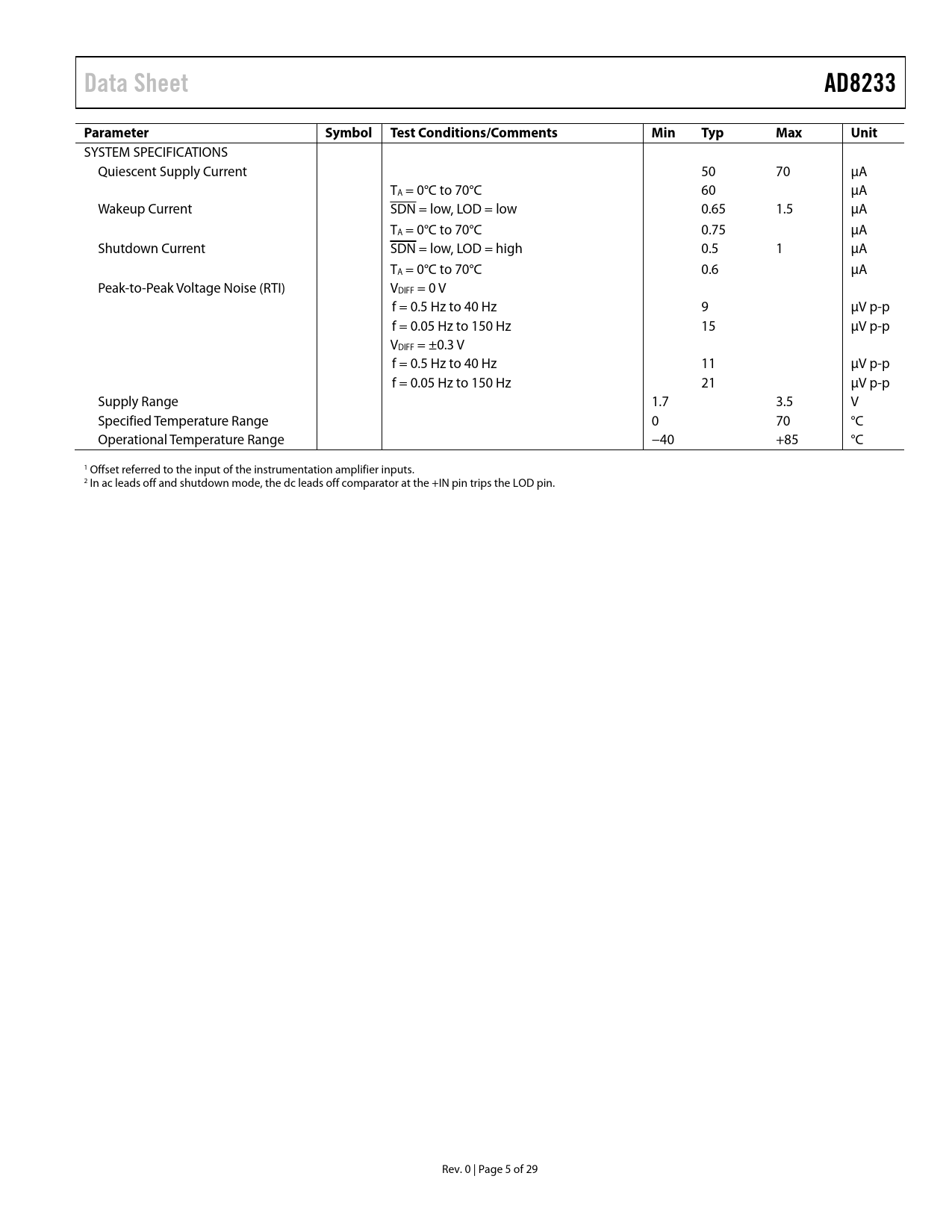 Data SheetAD8233Parameter SymbolTestConditions/CommentsMinTypMaxUnit SYSTEM SPECIFICATIONS Quiescent Supply Current 50 70 μA TA = 0°C to 70°C 60 μA Wakeup Current SDN = low, LOD = low 0.65 1.5 μA TA = 0°C to 70°C 0.75 μA Shutdown Current SDN = low, LOD = high 0.5 1 μA TA = 0°C to 70°C 0.6 μA Peak-to-Peak Voltage Noise (RTI) VDIFF = 0 V f = 0.5 Hz to 40 Hz 9 μV p-p f = 0.05 Hz to 150 Hz 15 μV p-p VDIFF = ±0.3 V f = 0.5 Hz to 40 Hz 11 μV p-p f = 0.05 Hz to 150 Hz 21 μV p-p Supply Range 1.7 3.5 V Specified Temperature Range 0 70 °C Operational Temperature Range −40 +85 °C 1 Offset referred to the input of the instrumentation amplifier inputs. 2 In ac leads off and shutdown mode, the dc leads off comparator at the +IN pin trips the LOD pin. Rev. 0 | Page 5 of 29 Document Outline FEATURES APPLICATIONS FUNCTIONAL BLOCK DIAGRAM GENERAL DESCRIPTION TABLE OF CONTENTS REVISION HISTORY SPECIFICATIONS ABSOLUTE MAXIMUM RATINGS THERMAL RESISTANCE PIN CONFIGURATION AND FUNCTION DESCRIPTIONS TYPICAL PERFORMANCE CHARACTERISTICS INSTRUMENTATION AMPLIFIER PERFORMANCE CHARACTERISTICS OPERATIONAL AMPLIFIER PERFORMANCE CHARACTERISTICS RIGHT LEG DRIVE (RLD) AMPLIFIER PERFORMANCE CHARACTERISTICS REFERENCE BUFFER PERFORMANCE CHARACTERISTICS SYSTEM PERFORMANCE CHARACTERISTICS THEORY OF OPERATION ARCHITECTURE OVERVIEW INSTRUMENTATION AMPLIFIER OPERATIONAL AMPLIFIER RIGHT LEG DRIVE AMPLIFIER REFERENCE BUFFER FAST RESTORE CIRCUIT LEADS ON/OFF DETECTION DC Leads On/Off Detection AC Leads On/Off Detection STANDBY OPERATION INPUT PROTECTION RADIO FREQUENCY INTERFERENCE (RFI) POWER SUPPLY REGULATION AND BYPASSING INPUT REFERRED OFFSETS LAYOUT RECOMMENDATIONS APPLICATIONS INFORMATION ELIMINATING ELECTRODE OFFSETS HIGH-PASS FILTERING Two-Pole High-Pass Filter Additional High-Pass Filtering Options LOW-PASS FILTERING AND GAIN Driving ADCs DRIVEN ELECTRODE APPLICATION CIRCUITS HEART RATE MEASUREMENT (HRM) NEXT TO THE HEART EXERCISE APPLICATION—HEART RATE MEASURED AT THE HANDS HOLTER MONITOR CONFIGURATION SYNCHRONIZED ECG AND PPG MEASUREMENT PACKAGING AND ORDERING INFORMATION OUTLINE DIMENSIONS ORDERING GUIDE