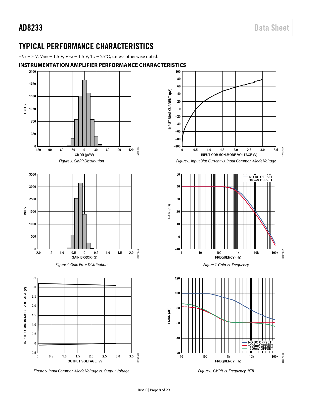 AD8233Data SheetTYPICAL PERFORMANCE CHARACTERISTICS +VS = 3 V, VREF = 1.5 V, VCM = 1.5 V, TA = 25°C, unless otherwise noted. INSTRUMENTATION AMPLIFIER PERFORMANCE CHARACTERISTICS210010080175060A) p401400( NT E20S T 10500CURRUNIS A–20BI700UT P–40IN–60350–800–100–120–90–60–300306090120 03 06 0 00.51.01.52.02.53.03.5 0 37- 37- CMRR (µV/V)INPUT COMMON-MODE VOLTAGE (V) 137 137 Figure 3. CMRR Distribution Figure 6. Input Bias Current vs. Input Common-Mode Voltage 350050NO DC OFFSET300mV OFFSET300040250030)SBT 1500(d20INUNIGA10001050000–10–2.0–1.5–1.0–0.500.51.01.52.0 04 07 0 1101001k10k100k 0 37- 37- GAIN ERROR (%)FREQUENCY (Hz) 137 137 Figure 4. Gain Error Distribution Figure 7. Gain vs. Frequency 3.51203.0E (V)100G2.5A T L2.0E VO80B)DdO1.5-MRR (N O1.0CM60MM O C0.5T PU40IN0NO DC OFFSET+300mV OFFSET–300mV OFFSET–0.52000.51.01.52.02.53.03.5 05 0 101001k10k100k 08 0 37- 37- OUTPUT VOLTAGE (V)FREQUENCY (Hz) 137 137 Figure 5. Input Common-Mode Voltage vs. Output Voltage Figure 8. CMRR vs. Frequency (RTI) Rev. 0 | Page 8 of 29 Document Outline FEATURES APPLICATIONS FUNCTIONAL BLOCK DIAGRAM GENERAL DESCRIPTION TABLE OF CONTENTS REVISION HISTORY SPECIFICATIONS ABSOLUTE MAXIMUM RATINGS THERMAL RESISTANCE PIN CONFIGURATION AND FUNCTION DESCRIPTIONS TYPICAL PERFORMANCE CHARACTERISTICS INSTRUMENTATION AMPLIFIER PERFORMANCE CHARACTERISTICS OPERATIONAL AMPLIFIER PERFORMANCE CHARACTERISTICS RIGHT LEG DRIVE (RLD) AMPLIFIER PERFORMANCE CHARACTERISTICS REFERENCE BUFFER PERFORMANCE CHARACTERISTICS SYSTEM PERFORMANCE CHARACTERISTICS THEORY OF OPERATION ARCHITECTURE OVERVIEW INSTRUMENTATION AMPLIFIER OPERATIONAL AMPLIFIER RIGHT LEG DRIVE AMPLIFIER REFERENCE BUFFER FAST RESTORE CIRCUIT LEADS ON/OFF DETECTION DC Leads On/Off Detection AC Leads On/Off Detection STANDBY OPERATION INPUT PROTECTION RADIO FREQUENCY INTERFERENCE (RFI) POWER SUPPLY REGULATION AND BYPASSING INPUT REFERRED OFFSETS LAYOUT RECOMMENDATIONS APPLICATIONS INFORMATION ELIMINATING ELECTRODE OFFSETS HIGH-PASS FILTERING Two-Pole High-Pass Filter Additional High-Pass Filtering Options LOW-PASS FILTERING AND GAIN Driving ADCs DRIVEN ELECTRODE APPLICATION CIRCUITS HEART RATE MEASUREMENT (HRM) NEXT TO THE HEART EXERCISE APPLICATION—HEART RATE MEASURED AT THE HANDS HOLTER MONITOR CONFIGURATION SYNCHRONIZED ECG AND PPG MEASUREMENT PACKAGING AND ORDERING INFORMATION OUTLINE DIMENSIONS ORDERING GUIDE