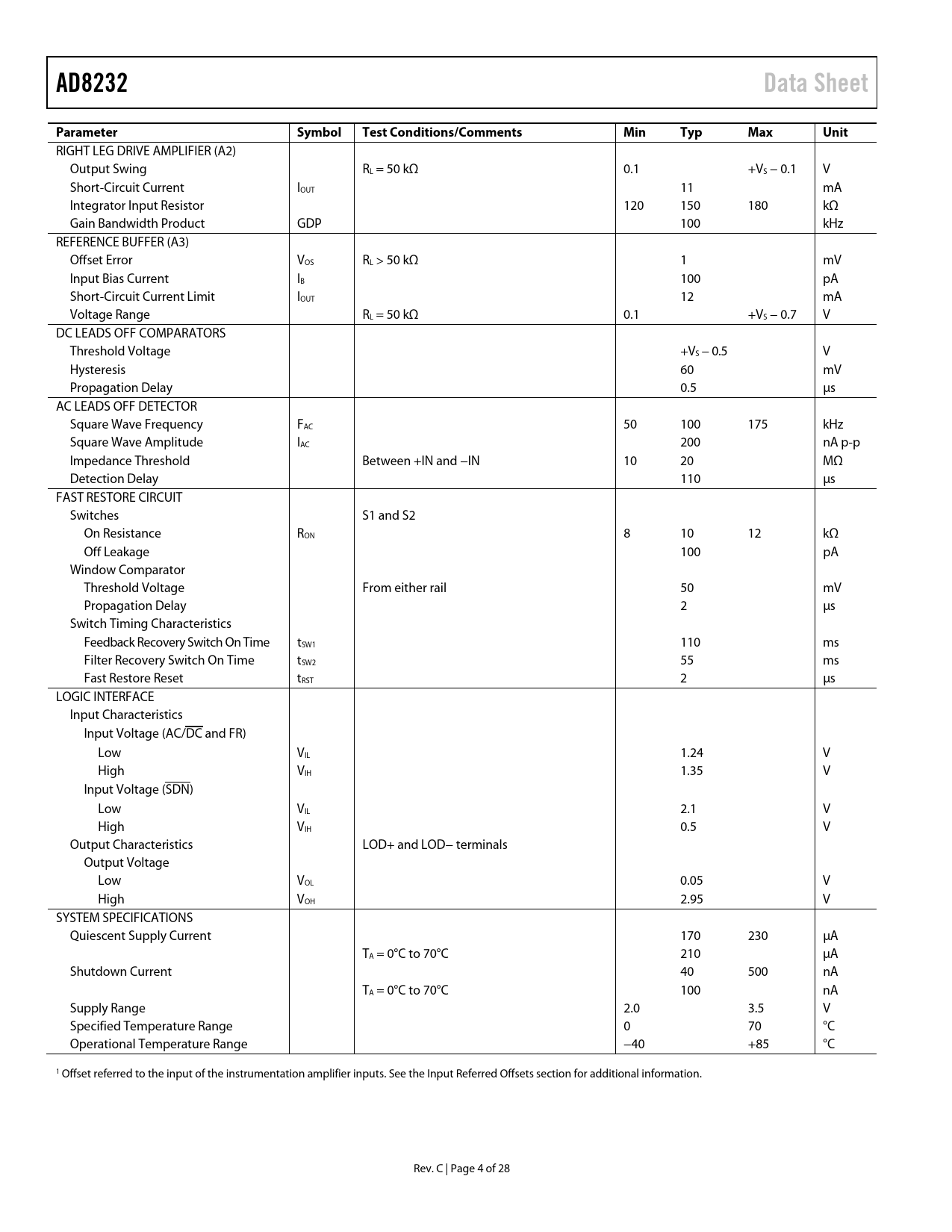 link to page 20 AD8232Data SheetParameterSymbolTest Conditions/CommentsMinTypMaxUnit RIGHT LEG DRIVE AMPLIFIER (A2) Output Swing RL = 50 kΩ 0.1 +VS − 0.1 V Short-Circuit Current IOUT 11 mA Integrator Input Resistor 120 150 180 kΩ Gain Bandwidth Product GDP 100 kHz REFERENCE BUFFER (A3) Offset Error VOS RL > 50 kΩ 1 mV Input Bias Current IB 100 pA Short-Circuit Current Limit IOUT 12 mA Voltage Range RL = 50 kΩ 0.1 +VS − 0.7 V DC LEADS OFF COMPARATORS Threshold Voltage +VS − 0.5 V Hysteresis 60 mV Propagation Delay 0.5 µs AC LEADS OFF DETECTOR Square Wave Frequency FAC 50 100 175 kHz Square Wave Amplitude IAC 200 nA p-p Impedance Threshold Between +IN and −IN 10 20 MΩ Detection Delay 110 μs FAST RESTORE CIRCUIT Switches S1 and S2 On Resistance RON 8 10 12 kΩ Off Leakage 100 pA Window Comparator Threshold Voltage From either rail 50 mV Propagation Delay 2 µs Switch Timing Characteristics Feedback Recovery Switch On Time tSW1 110 ms Filter Recovery Switch On Time tSW2 55 ms Fast Restore Reset tRST 2 µs LOGIC INTERFACE Input Characteristics Input Voltage (AC/DC and FR) Low VIL 1.24 V High VIH 1.35 V Input Voltage (SDN) Low VIL 2.1 V High VIH 0.5 V Output Characteristics LOD+ and LOD− terminals Output Voltage Low VOL 0.05 V High VOH 2.95 V SYSTEM SPECIFICATIONS Quiescent Supply Current 170 230 µA TA = 0°C to 70°C 210 µA Shutdown Current 40 500 nA TA = 0°C to 70°C 100 nA Supply Range 2.0 3.5 V Specified Temperature Range 0 70 °C Operational Temperature Range −40 +85 °C 1 Offset referred to the input of the instrumentation amplifier inputs. See the Input Referred Offsets section for additional information. Rev. C | Page 4 of 28 Document Outline Features Applications Functional Block Diagram General Description Revision History Specifications Absolute Maximum Ratings ESD Caution Pin Configuration and Function Descriptions Typical Performance Characteristics Instrumentation Amplifier Performance Curves Operational Amplifier Performance Curves Right Leg Drive (RLD) Amplifier Performance Curves Reference Buffer Performance Curves System Performance Curves Theory of Operation Architecture Overview Instrumentation Amplifier Operational Amplifier Right Leg Drive Amplifier Reference Buffer Fast Restore Circuit Leads Off Detection DC Leads Off Detection AC Leads Off Detection Standby Operation Input Protection Radio Frequency Interference (RFI) Power Supply Regulation and Bypassing Input Referred Offsets Layout Recommendations Applications Information Eliminating Electrode Offsets High-Pass Filtering Two-Pole High-Pass Filter Additional High-Pass Filtering Options Low-Pass Filtering and Gain Driving Analog-to-Digital Converters Driven Electrode Application Circuits Heart Rate Measurement Next to the Heart Exercise Application: Heart Rate Measured at the Hands Cardiac Monitor Configuration Portable Cardiac Monitor with Elimination of Motion Artifacts Packaging and Ordering Information Outline Dimensions Ordering Guide
