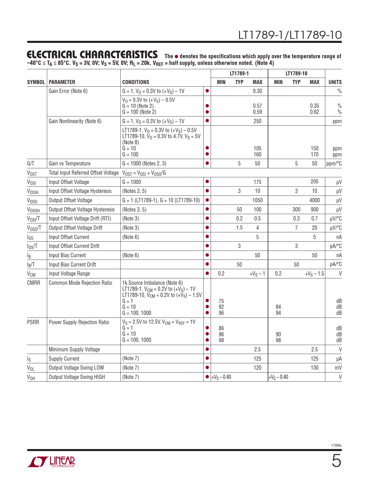 LT1789-1/LT1789-10 ELECTRICAL CHARACTERISTICSThe l denotes the specifications which apply over the temperature range of–40°C ≤ TA ≤ 85°C. VS = 3V, 0V; VS = 5V, 0V; RL = 20k, VREF = half supply, unless otherwise noted. (Note 4)LT1789-1LT1789-10SYMBOL PARAMETERCONDITIONSMINTYPMAXMINTYPMAXUNITS Gain Error (Note 6) G = 1, VO = 0.3V to (+VS) – 1V l 0.30 % VO = 0.3V to (+VS) – 0.5V G = 10 (Note 2) l 0.57 0.35 % G = 100 (Note 2) l 0.59 0.62 % Gain Nonlinearity (Note 6) G = 1, VO = 0.3V to (+VS) – 1V l 250 ppm LT1789-1, VO = 0.3V to (+VS) – 0.5V LT1789-10, VO = 0.3V to 4.7V, VS = 5V (Note 8) G = 10 l 105 150 ppm G = 100 l 160 170 ppm G/T Gain vs Temperature G < 1000 (Notes 2, 3) l 5 50 5 50 ppm/°C VOST Total Input Referred Offset Voltage VOST = VOSI + VOSO/G VOSI Input Offset Voltage G = 1000 l 175 205 µV VOSIH Input Offset Voltage Hysteresis (Notes 3, 5) l 3 10 3 10 µV VOSO Output Offset Voltage G = 1 (LT1789-1), G = 10 (LT1789-10) l 1050 4000 µV VOSOH Output Offset Voltage Hysteresis (Notes 3, 5) l 50 100 300 900 µV VOSI/T Input Offset Voltage Drift (RTI) (Note 3) l 0.2 0.5 0.3 0.7 µV/°C VOSO/T Output Offset Voltage Drift (Note 3) l 1.5 4 7 20 µV/°C IOS Input Offset Current (Note 6) l 5 5 nA IOS/T Input Offset Current Drift l 3 3 pA/°C IB Input Bias Current (Note 6) l 50 50 nA IB/T Input Bias Current Drift l 50 50 pA/°C VCM Input Voltage Range l 0.2 +VS – 1 0.2 +VS – 1.5 V CMRR Common Mode Rejection Ratio 1k Source Imbalance (Note 6) LT1789-1, VCM = 0.2V to (+VS) – 1V LT1789-10, VCM = 0.2V to (+VS) – 1.5V G = 1 l 75 dB G = 10 l 92 84 dB G = 100, 1000 l 96 94 dB PSRR Power Supply Rejection Ratio VS = 2.5V to 12.5V, VCM = VREF = 1V G = 1 l 86 dB G = 10 l 96 90 dB G = 100, 1000 l 98 98 dB Minimum Supply Voltage l 2.5 2.5 V IS Supply Current (Note 7) l 125 125 µA VOL Output Voltage Swing LOW (Note 7) l 120 130 mV VOH Output Voltage Swing HIGH (Note 7) l +VS – 0.40 +VS – 0.40 V 1789fc 5