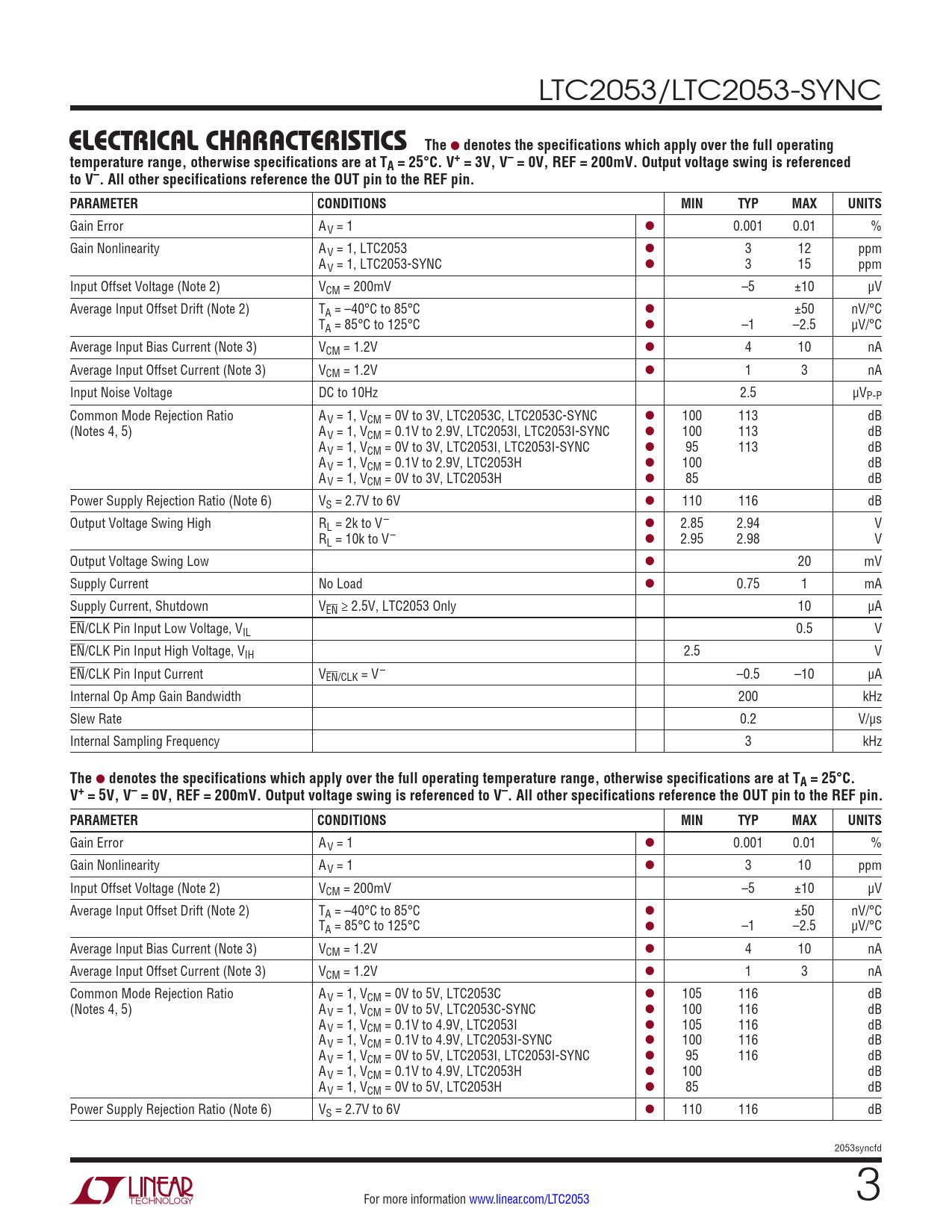 Gain Error AV = 1 l 0.001 0.01 % Gain Nonlinearity AV = 1, LTC2053 l 3 12 ppm AV = 1, LTC2053-SYNC l 3 15 ppm Input Offset Voltage (Note 2) VCM = 200mV –5 ±10 µV Average Input Offset Drift (Note 2) TA = –40°C to 85°C l ±50 nV/°C TA = 85°C to 125°C l –1 –2.5 µV/°C Average Input Bias Current (Note 3) VCM = 1.2V l 4 10 nA Average Input Offset Current (Note 3) VCM = 1.2V l 1 3 nA Input Noise Voltage DC to 10Hz 2.5 µVP-P Common Mode Rejection Ratio AV = 1, VCM = 0V to 3V, LTC2053C, LTC2053C-SYNC l 100 113 dB (Notes 4, 5) AV = 1, VCM = 0.1V to 2.9V, LTC2053I, LTC2053I-SYNC l 100 113 dB AV = 1, VCM = 0V to 3V, LTC2053I, LTC2053I-SYNC l 95 113 dB AV = 1, VCM = 0.1V to 2.9V, LTC2053H l 100 dB AV = 1, VCM = 0V to 3V, LTC2053H l 85 dB Power Supply Rejection Ratio (Note 6) VS = 2.7V to 6V l 110 116 dB Output Voltage Swing High RL = 2k to V– l 2.85 2.94 V RL = 10k to V– l 2.95 2.98 V Output Voltage Swing Low l 20 mV Supply Current No Load l 0.75 1 mA Supply Current, Shutdown VEN ≥ 2.5V, LTC2053 Only 10 µA EN/CLK Pin Input Low Voltage, VIL 0.5 V EN/CLK Pin Input High Voltage, VIH 2.5 V EN/CLK Pin Input Current VEN/CLK = V– –0.5 –10 µA Internal Op Amp Gain Bandwidth 200 kHz Slew Rate 0.2 V/µs Internal Sampling Frequency 3 kHz