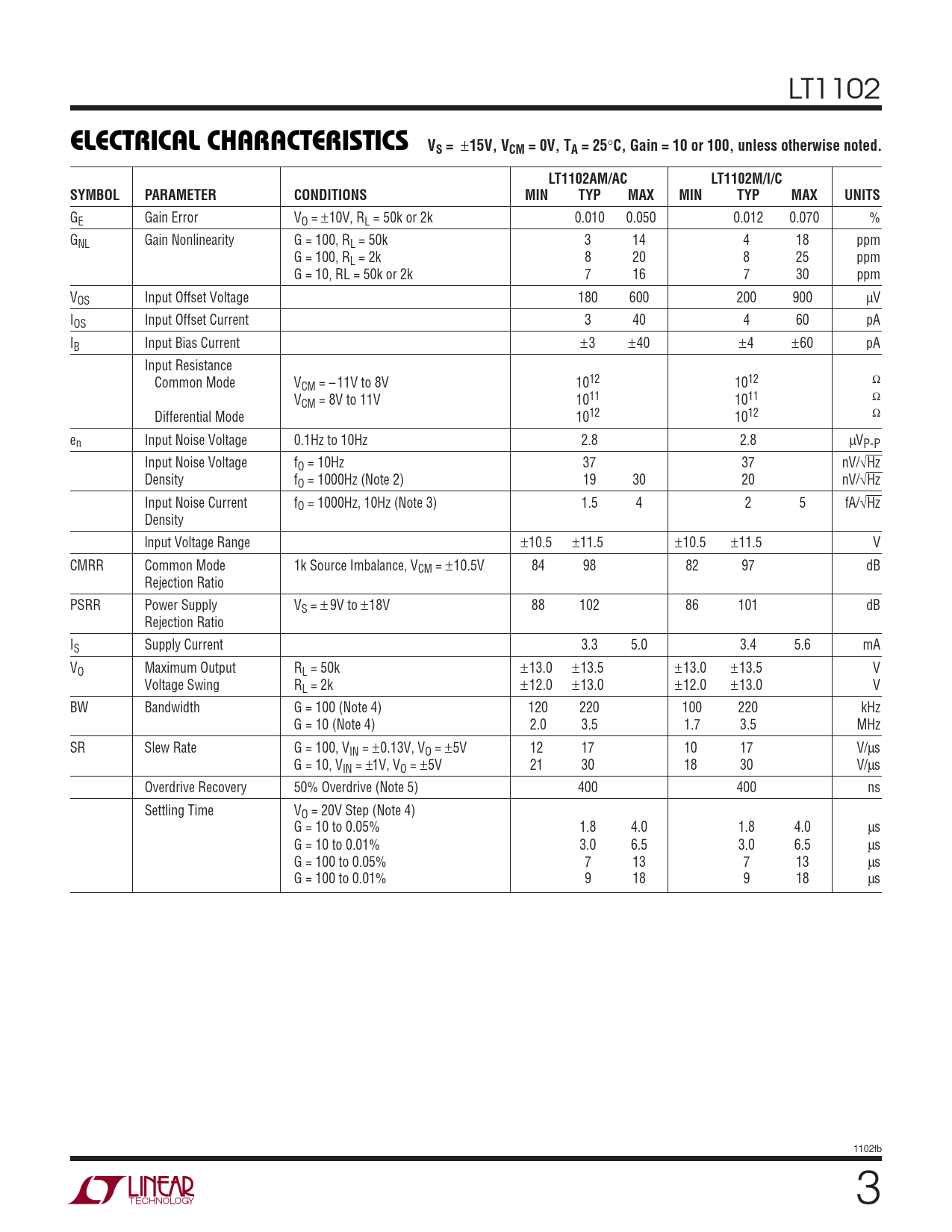 ELECTRICAL CHARACTERISTICS VS =. 15V, VCM = 0V, TA = 25. C, Gain = 10 or 100, unless otherwise noted. LT1102AM/AC. LT1102M/I/C