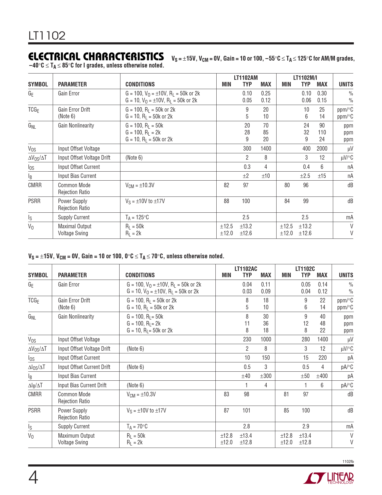 LT1102 ELECTRICAL CHARACTERISTICS VS = ± 15V, VCM = 0V, Gain = 10 or 100, –55 ° C ≤ TA ≤ 125 ° C for AM/M grades,–40 ° C ≤ TA ≤ 85 ° C for I grades, unless otherwise noted.LT1102AMLT1102M/ISYMBOLPARAMETERCONDITIONSMINTYPMAXMINTYPMAXUNITS GE Gain Error G = 100, VO = ±10V, RL = 50k or 2k 0.10 0.25 0.10 0.30 % G = 10, VO = ±10V, RL = 50k or 2k 0.05 0.12 0.06 0.15 % TCGE Gain Error Drift G = 100, RL = 50k or 2k 9 20 10 25 ppm/°C (Note 6) G = 10, RL = 50k or 2k 5 10 6 14 ppm/°C GNL Gain Nonlinearity G = 100, RL = 50k 20 70 24 90 ppm G = 100, RL = 2k 28 85 32 110 ppm G = 10, RL = 50k or 2k 9 20 9 24 ppm VOS Input Offset Voltage 300 1400 400 2000 μV ΔVOS/ΔT Input Offset Voltage Drift (Note 6) 2 8 3 12 μV/°C lOS Input Offset Current 0.3 4 0.4 6 nA IB Input Bias Current ±2 ±10 ±2.5 ±15 nA CMRR Common Mode VCM = ±10.3V 82 97 80 96 dB Rejection Ratio PSRR Power Supply VS = ±10V to ±17V 88 100 84 99 dB Rejection Ratio IS Supply Current TA = 125°C 2.5 2.5 mA VO Maximal Output RL = 50k ±12.5 ±13.2 ±12.5 ±13.2 V Voltage Swing RL = 2k ±12.0 ±12.6 ±12.0 ±12.6 V VS = ± 15V, VCM = 0V, Gain = 10 or 100, 0 ° C ≤ TA ≤ 70 ° C, unless otherwise noted.LT1102ACLT1102CSYMBOLPARAMETERCONDITIONSMINTYPMAXMINTYPMAXUNITS GE Gain Error G = 100, VO = ±10V, RL = 50k or 2k 0.04 0.11 0.05 0.14 % G = 10, VO = ±10V, RL = 50k or 2k 0.03 0.09 0.04 0.12 % TCGE Gain Error Drift G = 100, RL = 50k or 2k 8 18 9 22 ppm/°C (Note 6) G = 10, RL = 50k or 2k 5 10 6 14 ppm/°C GNL Gain Nonlinearity G = 100, RL= 50k 8 30 9 40 ppm G = 100, RL= 2k 11 36 12 48 ppm G = 10, RL= 50k or 2k 8 18 8 22 ppm VOS Input Offset Voltage 230 1000 280 1400 μV ΔVOS/ΔT Input Offset Voltage Drift (Note 6) 2 8 3 12 μV/°C IOS Input Offset Current 10 150 15 220 pA ΔIOS/ΔT Input Offset Current Drift (Note 6) 0.5 3 0.5 4 pA/°C IB Input Bias Current ±40 ±300 ±50 ±400 pA ΔIB/ΔT lnput Bias Current Drift (Note 6) 1 4 1 6 pA/°C CMRR Common Mode VCM = ±10.3V 83 98 81 97 dB Rejection Ratio PSRR Power Supply VS = ±10V to ±17V 87 101 85 100 dB Rejection Ratio IS Supply Current TA = 70°C 2.8 2.9 mA VO Maximum Output RL = 50k ±12.8 ±13.4 ±12.8 ±13.4 V Voltage Swing RL = 2k ±12.0 ±12.8 ±12.0 ±12.8 V 1102fb 4