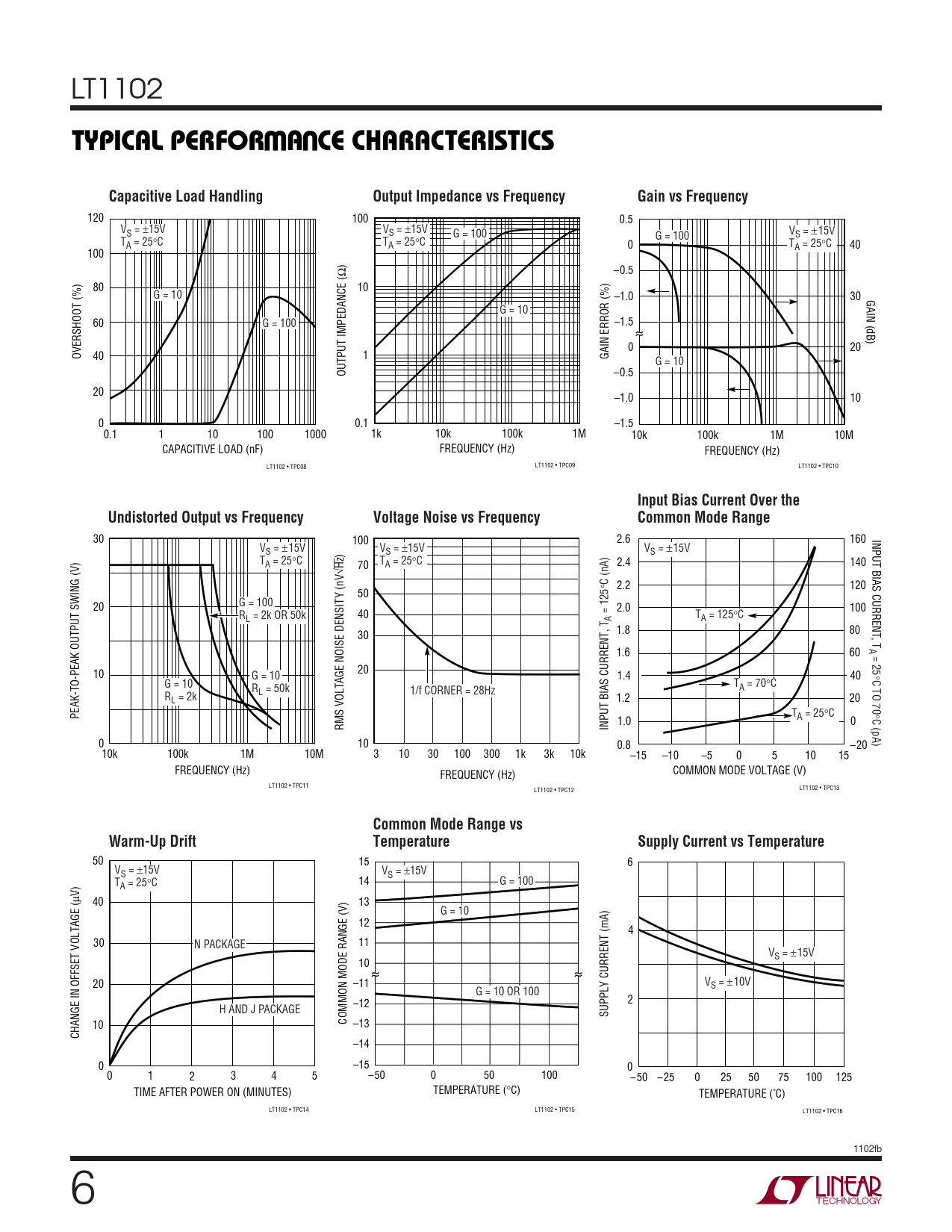 LT1102 WUTYPICAL PERFOR A CE CHARACTERISTICSCapacitive Load HandlingOutput Impedance vs FrequencyGain vs Frequency 120 100 0.5 VS = ±15V VS = ±15V G = 100 VS = ±15V G = 100 TA = 25°C TA = 25°C 0 TA = 25°C 40 100 ) Ω –0.5 80 10 G = 10 –1.0 30 GAIN (dB) G = 10 60 G = 100 –1.5 0 20 OVERSHOOT (%) 40 1 GAIN ERROR (%) G = 10 OUTPUT IMPEDANCE ( –0.5 20 –1.0 10 0 0.1 –1.5 0.1 1 10 100 1000 1k 10k 100k 1M 10k 100k 1M 10M CAPACITIVE LOAD (nF) FREQUENCY (Hz) FREQUENCY (Hz) LT1102 • TPC08 LT1102 • TPC09 LT1102 • TPC10 Input Bias Current Over theUndistorted Output vs FrequencyVoltage Noise vs FrequencyCommon Mode Range 30 100 INPUT BIAS CURRENT, 2.6 160 VS = ±15V VS = ±15V VS = ±15V TA = 25°C T 2.4 140 √Hz) 70 A = 25°C °C (nA) 2.2 120 50 20 G = 100 2.0 100 R = 125 T L = 2k OR 50k 40 T A A = 125°C 1.8 80 30 TA = 25 1.6 60 10 20 G = 10 ° 1.4 40 C TO 70 G = 10 R T 1/f CORNER = 28Hz A = 70°C R L = 50k L = 2k 1.2 20 PEAK-TO-PEAK OUTPUT SWING (V) T ° A = 25°C C (pA) 1.0 0 RMS VOLTAGE NOISE DENSITY (nV INPUT BIAS CURRENT, 0 10 0.8 –20 10k 100k 1M 10M 3 10 30 100 300 1k 3k 10k –15 –10 –5 0 5 10 15 FREQUENCY (Hz) FREQUENCY (Hz) COMMON MODE VOLTAGE (V) LT1102 • TPC11 LT1102 • TPC12 LT1102 • TPC13 Common Mode Range vsWarm-Up DriftTemperatureSupply Current vs Temperature 50 15 6 VS = ±15V VS = ±15V T 14 G = 100 A = 25°C μV) 40 13 G = 10 12 4 30 N PACKAGE 11 VS = ±15V 10 20 –11 VS = ±10V G = 10 OR 100 –12 2 H AND J PACKAGE SUPPLY CURRENT (mA) 10 COMMON MODE RANGE (V) –13 CHANGE IN OFFSET VOLTAGE ( –14 0 –15 0 0 1 2 3 4 5 –50 0 50 100 –50 –25 0 25 50 75 100 125 TIME AFTER POWER ON (MINUTES) TEMPERATURE (°C) TEMPERATURE (˚C) LT1102 • TPC14 LT1102 • TPC15 LT1102 • TPC16 1102fb 6