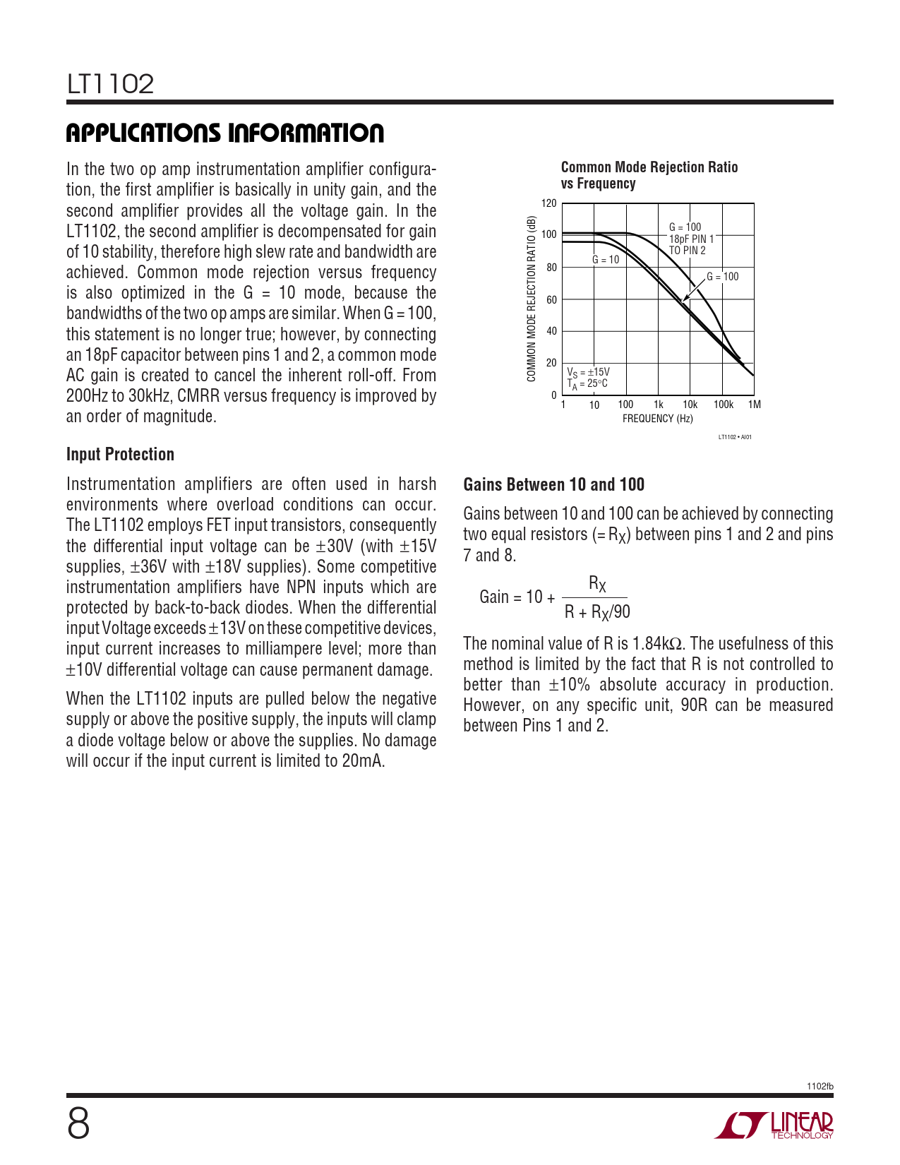 LT1102 UUWUAPPLICATIO S I FOR ATIO In the two op amp instrumentation amplifier configura- Common Mode Rejection Ratio tion, the first amplifier is basically in unity gain, and the vs Frequency second amplifier provides all the voltage gain. In the 120 LT1102, the second amplifier is decompensated for gain G = 100 100 18pF PIN 1 of 10 stability, therefore high slew rate and bandwidth are TO PIN 2 G = 10 achieved. Common mode rejection versus frequency 80 G = 100 is also optimized in the G = 10 mode, because the 60 bandwidths of the two op amps are similar. When G = 100, this statement is no longer true; however, by connecting 40 an 18pF capacitor between pins 1 and 2, a common mode 20 AC gain is created to cancel the inherent roll-off. From V COMMON MODE REJECTION RATIO (dB) S = ±15V TA = 25°C 200Hz to 30kHz, CMRR versus frequency is improved by 0 1 10 100 1k 10k 100k 1M an order of magnitude. FREQUENCY (Hz) LT1102 • AI01 Input Protection Instrumentation amplifiers are often used in harsh Gains Between 10 and 100 environments where overload conditions can occur. Gains between 10 and 100 can be achieved by connecting The LT1102 employs FET input transistors, consequently two equal resistors (= R the differential input voltage can be ±30V (with ±15V X) between pins 1 and 2 and pins 7 and 8. supplies, ±36V with ±18V supplies). Some competitive instrumentation amplifiers have NPN inputs which are RX Gain = 10 + protected by back-to-back diodes. When the differential R + RX/90 input Voltage exceeds ±13V on these competitive devices, input current increases to milliampere level; more than The nominal value of R is 1.84kΩ. The usefulness of this ±10V differential voltage can cause permanent damage. method is limited by the fact that R is not controlled to better than ±10% absolute accuracy in production. When the LT1102 inputs are pulled below the negative However, on any specific unit, 90R can be measured supply or above the positive supply, the inputs will clamp between Pins 1 and 2. a diode voltage below or above the supplies. No damage will occur if the input current is limited to 20mA. 1102fb 8