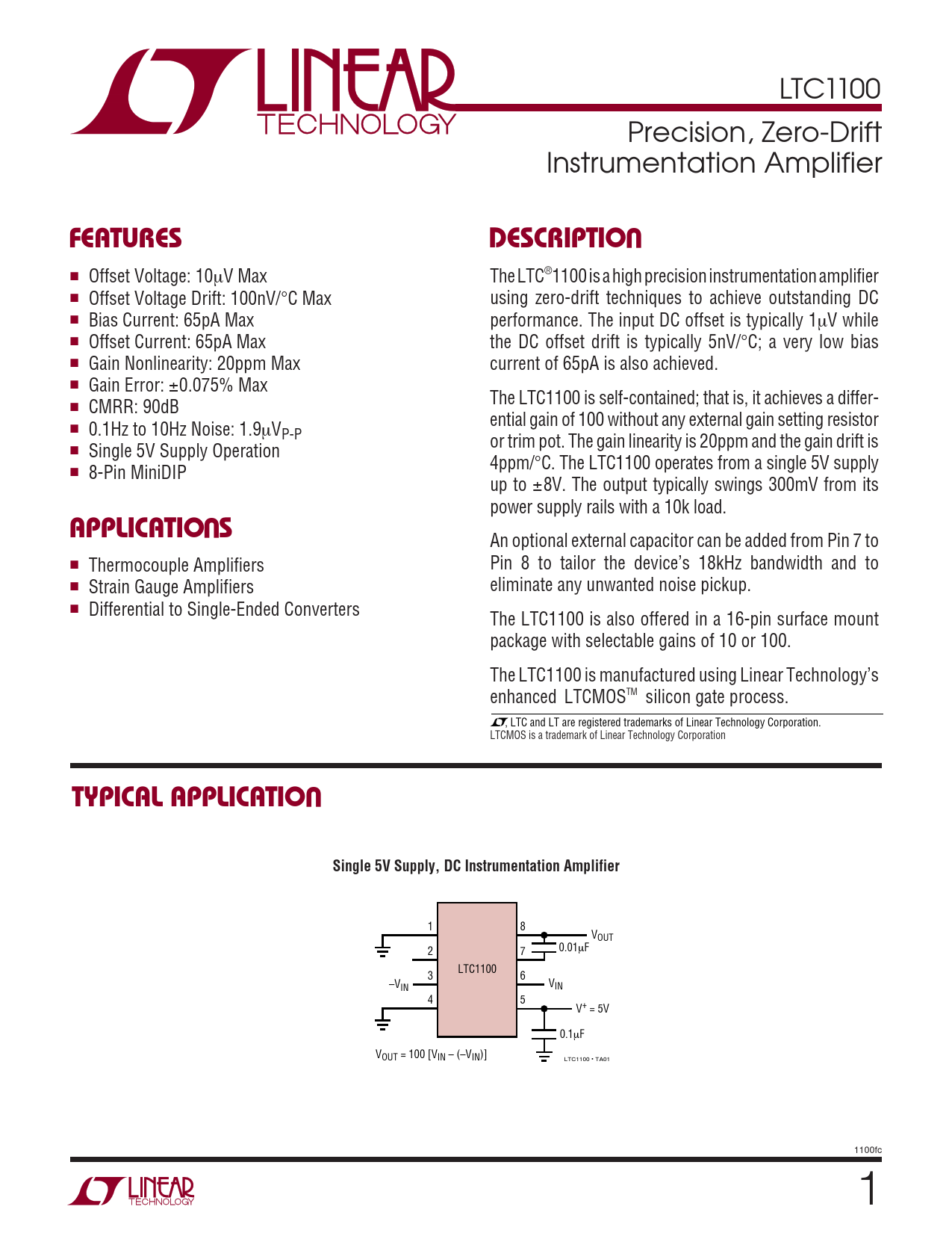 An optional external capacitor can be added from Pin 7 to ■ Thermocouple Amplifiers Pin 8 to tailor the device’s 18kHz bandwidth and to ■ Strain Gauge Amplifiers eliminate any unwanted noise pickup. ■ Differential to Single-Ended Converters The LTC1100 is also offered in a 16-pin surface mount package with selectable gains of 10 or 100. The LTC1100 is manufactured using Linear Technology’s enhanced LTCMOSTM silicon gate process. , LTC and LT are registered trademarks of Linear Technology Corporation. LTCMOS is a trademark of Linear Technology Corporation