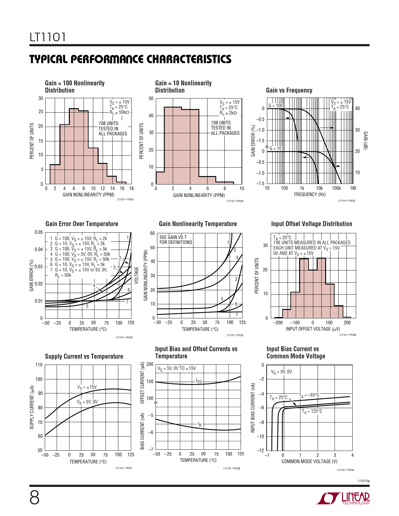 LT1101 WUTYPICAL PERFOR A CE CHARACTERISTICSGain = 100 NonlinearityGain = 10 NonlinearityDistributionDistributionGain vs Frequency 30 50 VS = ± 15V V V S = ± 15V S = ± 15V T G = 100 A = 25°C T T A = 25°C 0 A = 25°C 40 25 RL ≥ 50kΩ R 40 L ≥ 2kΩ –0.5 708 UNITS 708 UNITS 20 TESTED IN TESTED IN –1.0 30 GAIN (dB) ALL PACKAGES 30 ALL PACKAGES 15 –1.5 20 G = 10 0 20 10 GAIN ERROR (%) PERCENT OF UNITS PERCENT OF UNITS –0.5 10 5 –1.0 10 0 0 –1.5 0 2 4 6 8 10 12 14 16 18 0 2 4 6 8 10 10 100 1k 10k 100k 1M GAIN NONLINEARITY (PPM) GAIN NONLINEARITY (PPM) FREQUENCY (Hz) LT1101 • TPC01 LT1101 • TPC02 LT1101 • TPC03 Gain Error Over TemperatureGain Nonlinearity TemperatureInput Offset Voltage Distribution 0.05 60 1 SEE GAIN VS T T 1 G = 100, V A = 25°C S = ± 15V, RL = 2k FOR DEFINITIONS 1 746 UNITS MEASURED IN ALL PACKAGES 2 G = 10, VS = ± 15V, RL = 2k 30 50 EACH UNIT MEASURED AT V 0.04 3 G = 100, V S = 15V, S = ± 15V, RL = 5k 3 0V AND AT V 4 G = 100, V S = ± 15V S = 5V, 0V, RL = 50k 5 G = 100, V 2 4 S = ± 15V, RL = 50k 40 6 G = 10, V 0.03 S = ± 15V, RL = 5k 3 7 G = 10, V 20 S = ± 15V or 5V, 0V, RL = 50k 30 2 VOLTAGE 0.02 4 GAIN ERROR (%) 6 20 PERCENT OF UNITS 10 5 0.01 GAIN NONLINEARITY (PPM) 7 10 5 6 7 0 0 0 –50 –25 0 25 50 75 100 125 – 50 – 25 0 25 50 75 100 125 –200 – 100 0 100 200 TEMPERATURE (°C) TEMPERATURE (°C) INPUT OFFSET VOLTAGE (µV) LT1101 • TPC05 LT1101 • TPC06 LT1101 • TPC04 Input Bias and Offset Currents vsInput Bias Current vsSupply Current vs TemperatureTemperatureCommon Mode Voltage 110 200 0 VS = 5V, 0V TO ±15V VS = 5V, 0V 100 –2 150 IOS A) V µ S = ± 15V 90 –4 T 100 A = –55°C TA = 25°C V OFFSET CURRENT (pA) S = 5V, 0V 80 –6 TA = 125°C –5 70 I –8 B SUPPLY CURRENT ( – 6 INPUT BIAS CURRENT (nA) 60 –10 BIAS CURRENT (nA) –7 50 –12 – 50 50 100 125 – 25 0 25 50 75 100 125 –50 –25 0 25 75 –1 0 1 2 3 4 TEMPERATURE (°C) TEMPERATURE (°C) COMMON MODE VOLTAGE (V) LT1101 • TPC07 LT1101 • TPC08 LT1101 • TPC09 1101fa 8