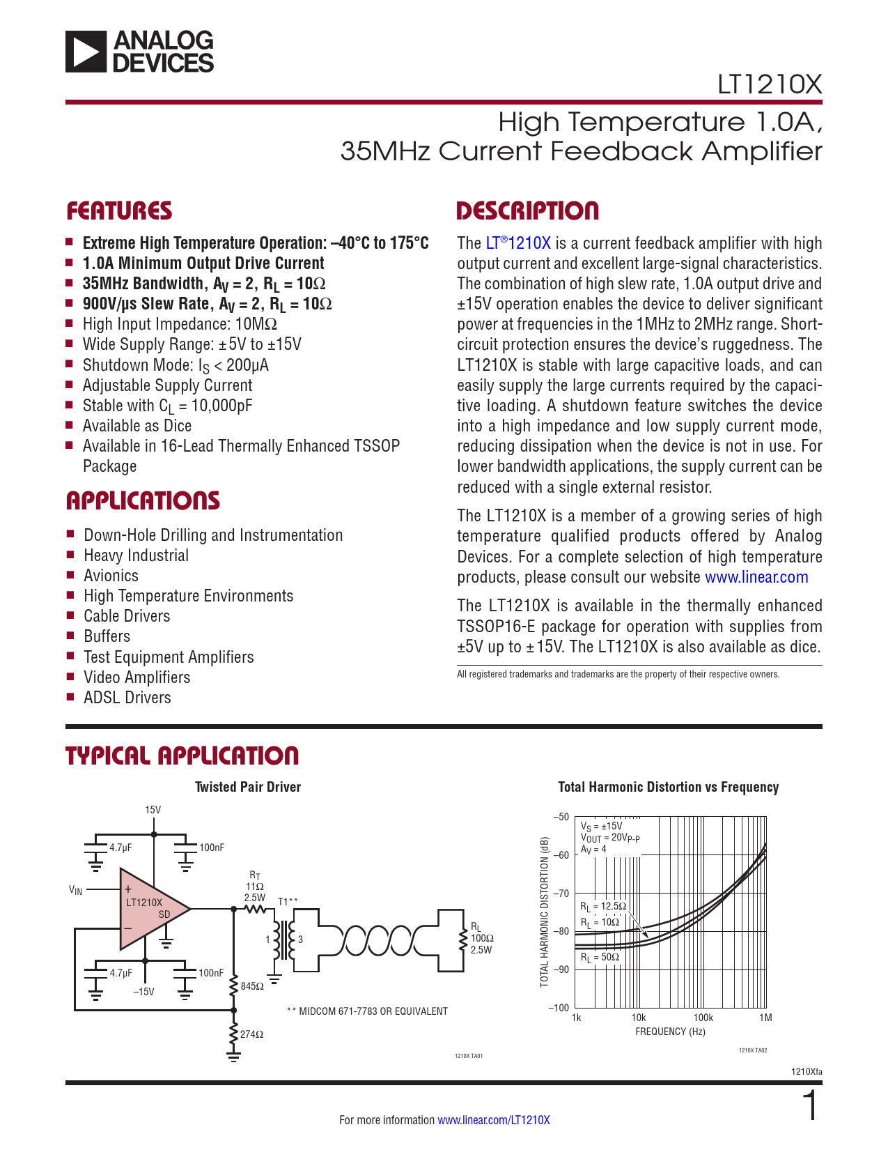 LT1210X High Temperature 1.0A, 35MHz Current Feedback Amplifier FEATURES DESCRIPTION n