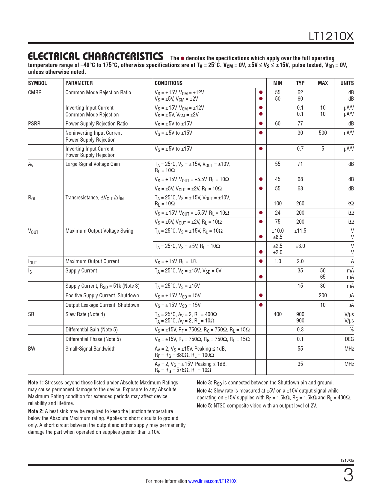 LT1210X ELECTRICAL CHARACTERISTICS The l denotes the specifications which apply over the full operatingtemperature range of –40°C to 175°C, otherwise specifications are at TA = 25°C. VCM = 0V, ±5V ≤ VS ≤ ±15V, pulse tested, VSD = 0V,unless otherwise noted.SYMBOLPARAMETERCONDITIONSMINTYPMAXUNITS CMRR Common Mode Rejection Ratio VS = ±15V, VCM = ±12V l 55 62 dB VS = ±5V, VCM = ±2V l 50 60 dB Inverting Input Current VS = ±15V, VCM = ±12V l 0.1 10 µA/V Common Mode Rejection VS = ±5V, VCM = ±2V l 0.1 10 µA/V PSRR Power Supply Rejection Ratio VS = ±5V to ±15V l 60 77 dB Noninverting Input Current VS = ±5V to ±15V l 30 500 nA/V Power Supply Rejection Inverting Input Current VS = ±5V to ±15V l 0.7 5 µA/V Power Supply Rejection AV Large-Signal Voltage Gain TA = 25°C, VS = ±15V, VOUT = ±10V, 55 71 dB RL = 10Ω VS = ±15V, VOUT = ±5.5V, RL = 10Ω l 45 68 dB VS = ±5V, VOUT = ±2V, RL = 10Ω l 55 68 dB R – OL Transresistance, ∆VOUT/∆IIN TA = 25°C, VS = ±15V, VOUT = ±10V, RL = 10Ω 100 260 kΩ VS = ±15V, VOUT = ±5.5V, RL = 10Ω l 24 200 kΩ VS = ±5V, VOUT = ±2V, RL = 10Ω l 75 200 kΩ VOUT Maximum Output Voltage Swing TA = 25°C, VS = ±15V, RL = 10Ω ±10.0 ±11.5 V l ±8.5 V TA = 25°C, VS = ±5V, RL = 10Ω ±2.5 ±3.0 V l ±2.0 V IOUT Maximum Output Current VS = ±15V, RL = 1Ω l 1.0 2.0 A IS Supply Current TA = 25°C, VS = ±15V, VSD = 0V 35 50 mA l 65 mA Supply Current, RSD = 51k (Note 3) TA = 25°C, VS = ±15V 15 30 mA Positive Supply Current, Shutdown VS = ±15V, VSD = 15V l 200 µA Output Leakage Current, Shutdown VS = ±15V, VSD = 15V l 10 µA SR Slew Rate (Note 4) TA = 25°C, AV = 2, RL = 400Ω 400 900 V/µs TA = 25°C, AV = 2, RL = 10Ω 900 V/µs Differential Gain (Note 5) VS = ±15V, RF = 750Ω, RG = 750Ω, RL = 15Ω 0.3 % Differential Phase (Note 5) VS = ±15V, RF = 750Ω, RG = 750Ω, RL = 15Ω 0.1 DEG BW Small-Signal Bandwidth AV = 2, VS = ±15V, Peaking ≤ 1dB, 55 MHz RF = RG = 680Ω, RL = 100Ω AV = 2, VS = ±15V, Peaking ≤ 1dB, 35 MHz RF = RG = 576Ω, RL = 10Ω Note 1: Stresses beyond those listed under Absolute Maximum Ratings Note 3: RSD is connected between the Shutdown pin and ground. may cause permanent damage to the device. Exposure to any Absolute Note 4: Slew rate is measured at ±5V on a ±10V output signal while Maximum Rating condition for extended periods may affect device operating on ±15V supplies with RF = 1.5k Ω , RG = 1.5k Ω and RL = 400Ω. reliability and lifetime. Note 5: NTSC composite video with an output level of 2V. Note 2: A heat sink may be required to keep the junction temperature below the Absolute Maximum rating. Applies to short circuits to ground only. A short circuit between the output and either supply may permanently damage the part when operated on supplies greater than ±10V. 1210Xfa For more information www.linear.com/LT1210X 3