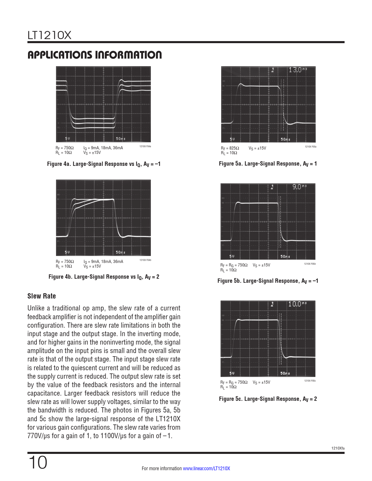 the bandwidth is reduced. The photos in Figures 5a, 5b and 5c show the large-signal response of the LT1210X for various gain configurations. The slew rate varies from 770V/µs for a gain of 1, to 1100V/µs for a gain of –1. 1210Xfa 10 For more information www.linear.com/LT1210X