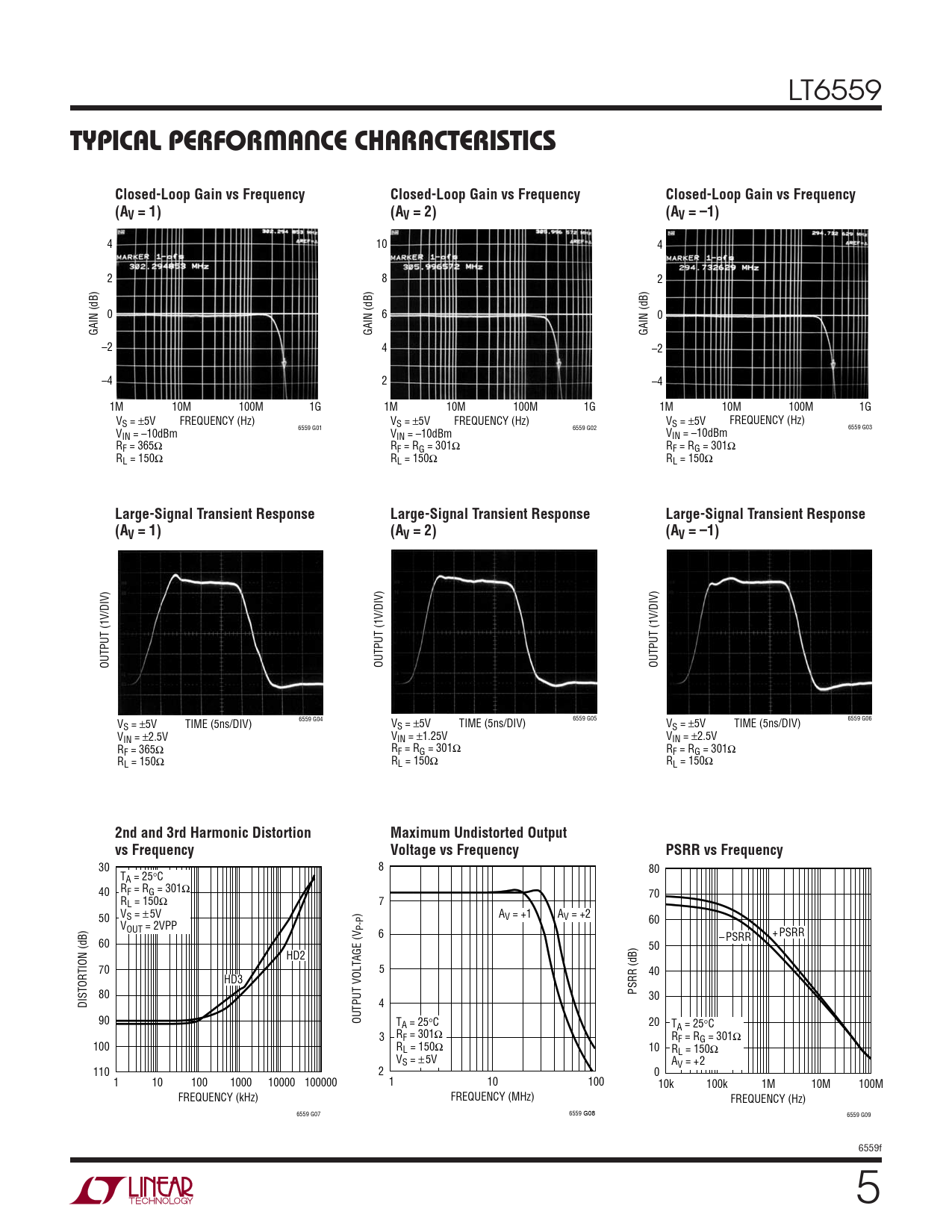 30 8 80 TA = 25°C 40 RF = RG = 301Ω 70 RL = 150Ω 7 ) 50 VS = ± 5V AV = +1 AV = +2 60 VOUT = 2VPP P-P 6 + PSRR – PSRR 60 50 HD2 70 5 40 HD3 80 PSRR (dB) 30 DISTORTION (dB) 4 90 OUTPUT VOLTAGE (V TA = 25°C 20 TA = 25°C 3 RF = 301Ω RF = RG = 301Ω 100 RL = 150Ω 10 RL = 150Ω VS = ± 5V AV = +2 110 2 0 1 10 100 1000 10000 100000 1 10 100 10k 100k 1M 10M 100M FREQUENCY (kHz) FREQUENCY (MHz) FREQUENCY (Hz) 6559 G07 6559 G08 6559 G09 6559f 5