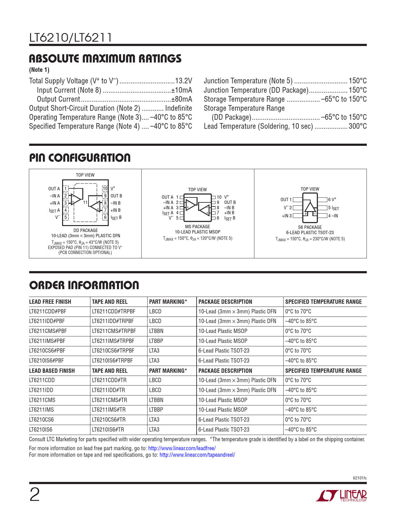 LT6211CDD#PBF LT6211CDD#TRPBF LBCD 10-Lead (3mm × 3mm) Plastic DFN 0°C to 70°C LT6211IDD#PBF LT6211IDD#TRPBF LBCD 10-Lead (3mm × 3mm) Plastic DFN –40°C to 85°C LT6211CMS#PBF LT6211CMS#TRPBF LTBBN 10-Lead Plastic MSOP 0°C to 70°C LT6211IMS#PBF LT6211IMS#TRPBF LTBBP 10-Lead Plastic MSOP –40°C to 85°C LT6210CS6#PBF LT6210CS6#TRPBF LTA3 6-Lead Plastic TSOT-23 0°C to 70°C LT6210IS6#PBF LT6210IS6#TRPBF LTA3 6-Lead Plastic TSOT-23 –40°C to 85°C