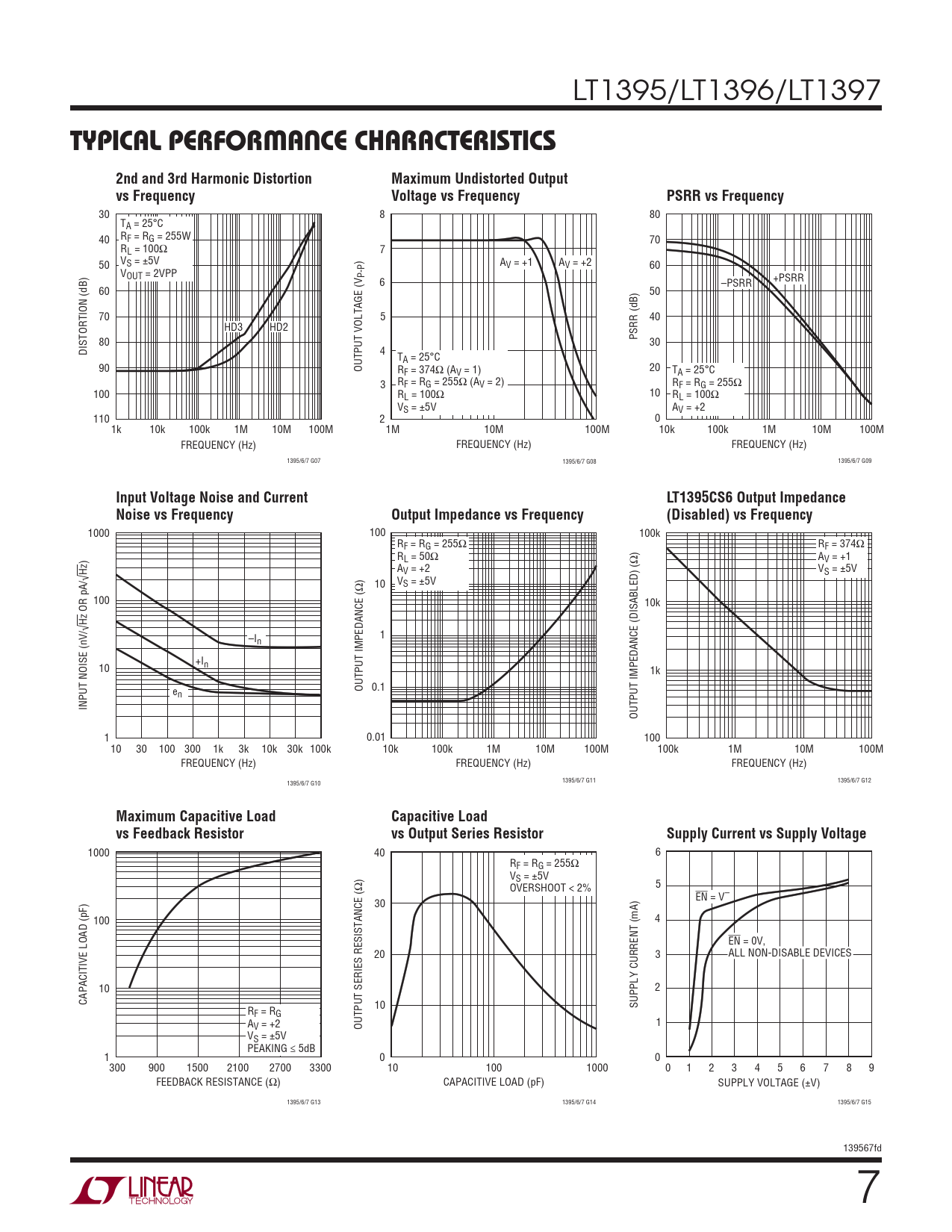 1000 40 6 RF = RG = 255Ω VS = ±5V OVERSHOOT < 2% 5 EN = V– 30 100 4 EN = 0V, 20 3 ALL NON-DISABLE DEVICES 10 2 CAPACITIVE LOAD (pF) 10 SUPPLY CURRENT (mA) RF = RG AV = +2 OUTPUT SERIES RESISTANCE (Ω) 1 VS = ±5V PEAKING ≤ 5dB 1 0 0 300 900 1500 2100 2700 3300 10 100 1000 0 1 2 3 4 5 6 7 8 9 FEEDBACK RESISTANCE (Ω) CAPACITIVE LOAD (pF) SUPPLY VOLTAGE (±V) 1395/6/7 G13 1395/6/7 G14 1395/6/7 G15 139567fd 7