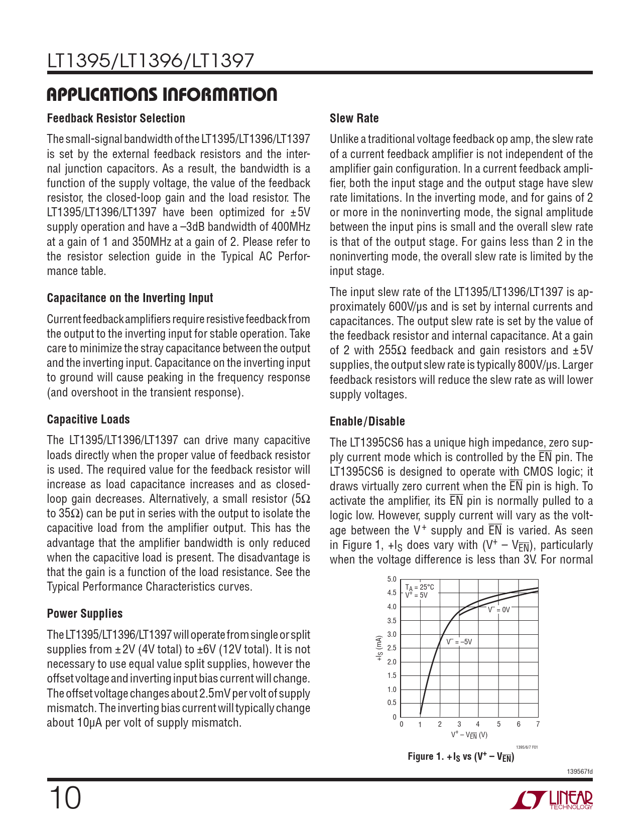The LT1395/LT1396/LT1397 can drive many capacitive The LT1395CS6 has a unique high impedance, zero sup- loads directly when the proper value of feedback resistor ply current mode which is controlled by the EN pin. The is used. The required value for the feedback resistor will LT1395CS6 is designed to operate with CMOS logic; it increase as load capacitance increases and as closed- draws virtually zero current when the EN pin is high. To loop gain decreases. Alternatively, a small resistor (5Ω activate the amplifi er, its EN pin is normally pulled to a to 35Ω) can be put in series with the output to isolate the logic low. However, supply current will vary as the volt- capacitive load from the amplifi er output. This has the age between the V + supply and EN is varied. As seen advantage that the amplifi er bandwidth is only reduced in Figure 1, +IS does vary with (V+ – VEN), particularly when the capacitive load is present. The disadvantage is when the voltage difference is less than 3V. For normal that the gain is a function of the load resistance. See the 5.0 Typical Performance Characteristics curves. TA = 25°C 4.5 V+ = 5V 4.0