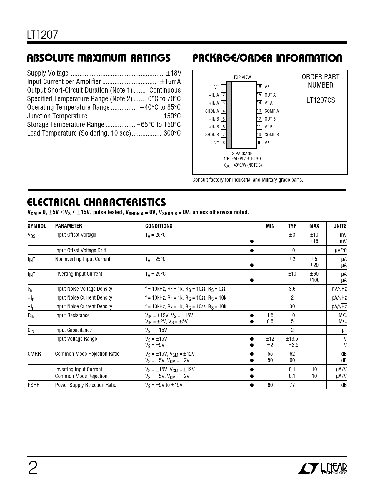 VOS Input Offset Voltage TA = 25°C ±3 ±10 mV ● ±15 mV Input Offset Voltage Drift ● 10 µV/°C I + IN Noninverting Input Current TA = 25°C ±2 ±5 µA ● ±20 µA I – IN Inverting Input Current TA = 25°C ±10 ±60 µA ● ±100 µA en Input Noise Voltage Density f = 10kHz, RF = 1k, RG = 10Ω, RS = 0Ω 3.6 nV/√Hz + in Input Noise Current Density f = 10kHz, RF = 1k, RG = 10Ω, RS = 10k 2 pA/√Hz – in Input Noise Current Density f = 10kHz, RF = 1k, RG = 10Ω, RS = 10k 30 pA/√Hz RIN Input Resistance VIN = ±12V, VS = ±15V ● 1.5 10 MΩ VIN = ±2V, VS = ±5V ● 0.5 5 MΩ CIN Input Capacitance VS = ±15V 2 pF Input Voltage Range VS = ±15V ● ±12 ±13.5 V VS = ±5V ● ±2 ±3.5 V CMRR Common Mode Rejection Ratio VS = ±15V, VCM = ±12V ● 55 62 dB VS = ±5V, VCM = ±2V ● 50 60 dB Inverting Input Current VS = ±15V, VCM = ±12V ● 0.1 10 µA/V Common Mode Rejection VS = ±5V, VCM = ±2V ● 0.1 10 µA/V PSRR Power Supply Rejection Ratio VS = ±5V to ±15V ● 60 77 dB 2