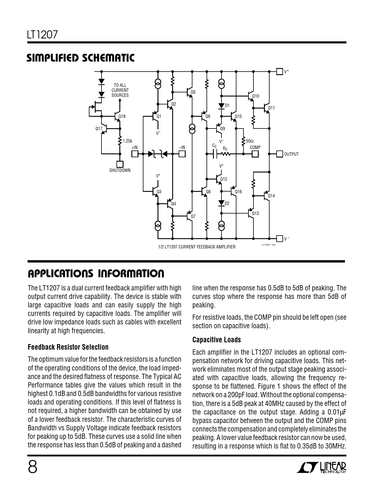 V+ TO ALL CURRENT Q5 SOURCES Q10 Q2 D1 Q11 Q18 Q1 Q6 Q15 Q17 Q9 V– 1.25k V– 50Ω CC +IN –IN R COMP C OUTPUT V+ SHUTDOWN V+ Q12 Q3 Q8 Q16 Q14 Q4 D2 Q13 Q7 V – LT1207 • SS 1/2 LT1207 CURRENT FEEDBACK AMPLIFIER