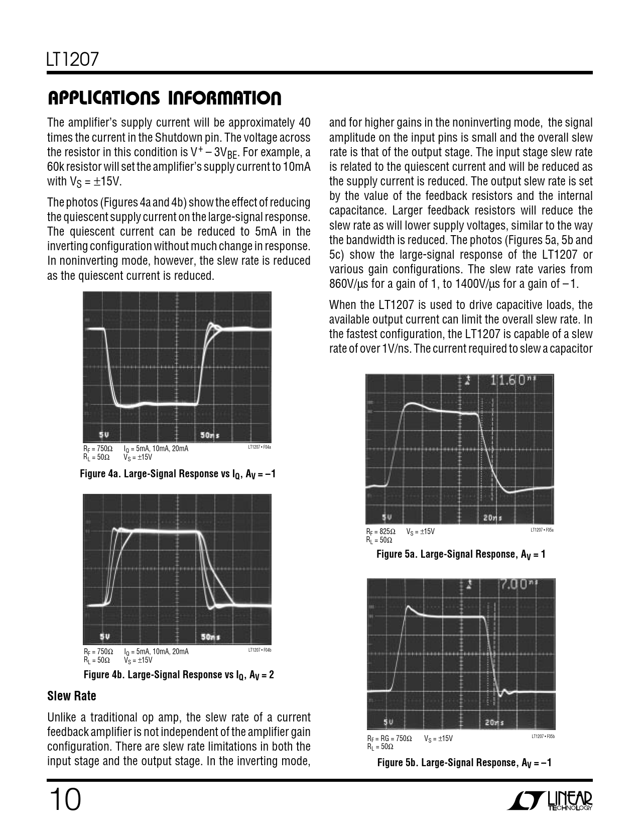 Unlike a traditional op amp, the slew rate of a current feedback amplifier is not independent of the amplifier gain LT1207 • F05b RF = RG = 750Ω VS = ±15V R configuration. There are slew rate limitations in both the L = 50Ω input stage and the output stage. In the inverting mode,