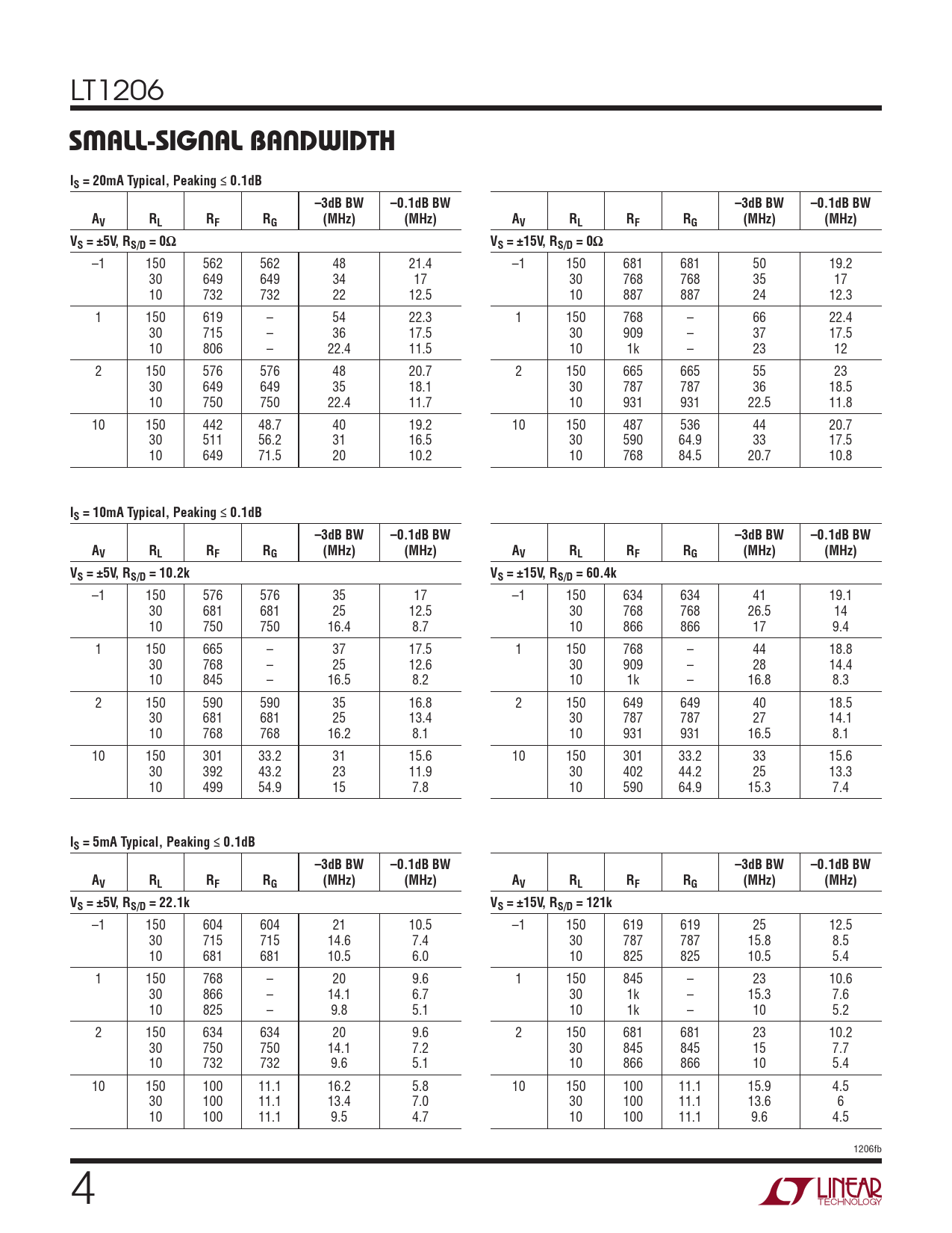 –1 150 604 604 21 10.5 –1 150 619 619 25 12.5 30 715 715 14.6 7.4 30 787 787 15.8 8.5 10 681 681 10.5 6.0 10 825 825 10.5 5.4 1 150 768 – 20 9.6 1 150 845 – 23 10.6 30 866 – 14.1 6.7 30 1k – 15.3 7.6 10 825 – 9.8 5.1 10 1k – 10 5.2 2 150 634 634 20 9.6 2 150 681 681 23 10.2 30 750 750 14.1 7.2 30 845 845 15 7.7 10 732 732 9.6 5.1 10 866 866 10 5.4 10 150 100 11.1 16.2 5.8 10 150 100 11.1 15.9 4.5 30 100 11.1 13.4 7.0 30 100 11.1 13.6 6 10 100 11.1 9.5 4.7 10 100 11.1 9.6 4.5 1206fb 4 Document Outline Features Applications Description Typical Application Absolute Maximum Ratings Pin Configuration Order Information Electrical Characteristics Small-Signal Bandwidth Typical Performance Characteristics Simplified Schematic Applications Information Package Description Revision History Related Parts
