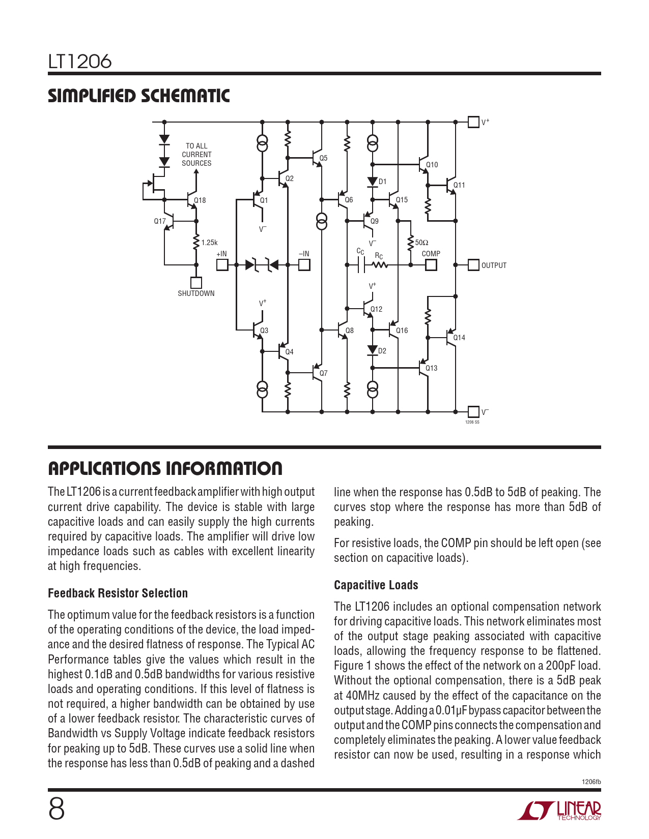 LT1206 siMpliFieD scheMaTic V+ TO ALL CURRENT Q5 SOURCES Q10 Q2 D1 Q11 Q18 Q1 Q6 Q15 Q17 Q9 V– 1.25k V– 50Ω CC +IN –IN RC COMP OUTPUT V+ SHUTDOWN V+ Q12 Q3 Q8 Q16 Q14 Q4 D2 Q13 Q7 V– 1206 SS applicaTions inForMaTion The LT1206 is a current feedback amplifier with high output line when the response has 0.5dB to 5dB of peaking. The current drive capability. The device is stable with large curves stop where the response has more than 5dB of capacitive loads and can easily supply the high currents peaking. required by capacitive loads. The amplifier will drive low For resistive loads, the COMP pin should be left open (see impedance loads such as cables with excellent linearity section on capacitive loads). at high frequencies. Capacitive LoadsFeedback Resistor Selection The LT1206 includes an optional compensation network The optimum value for the feedback resistors is a function for driving capacitive loads. This network eliminates most of the operating conditions of the device, the load imped- of the output stage peaking associated with capacitive ance and the desired flatness of response. The Typical AC loads, allowing the frequency response to be flattened. Performance tables give the values which result in the Figure 1 shows the effect of the network on a 200pF load. highest 0.1dB and 0.5dB bandwidths for various resistive Without the optional compensation, there is a 5dB peak loads and operating conditions. If this level of flatness is at 40MHz caused by the effect of the capacitance on the not required, a higher bandwidth can be obtained by use output stage. Adding a 0.01µF bypass capacitor between the of a lower feedback resistor. The characteristic curves of output and the COMP pins connects the compensation and Bandwidth vs Supply Voltage indicate feedback resistors completely eliminates the peaking. A lower value feedback for peaking up to 5dB. These curves use a solid line when resistor can now be used, resulting in a response which the response has less than 0.5dB of peaking and a dashed 1206fb 8 Document Outline Features Applications Description Typical Application Absolute Maximum Ratings Pin Configuration Order Information Electrical Characteristics Small-Signal Bandwidth Typical Performance Characteristics Simplified Schematic Applications Information Package Description Revision History Related Parts