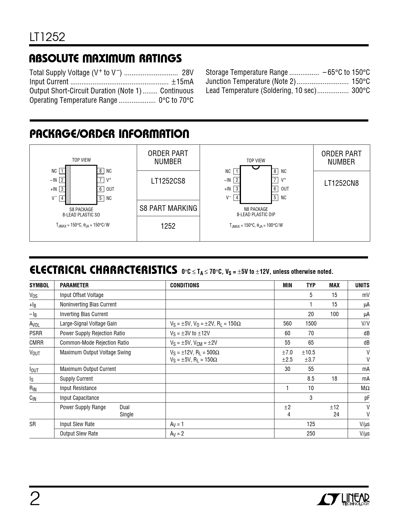ORDER PART ORDER PART TOP VIEW NUMBER TOP VIEW NUMBER NC 1 8 NC NC 1 8 NC – IN 2 7 V+ LT1252CS8 –IN 2 7 V+ LT1252CN8 +IN 3 6 OUT +IN 3 6 OUT – V – 4 5 NC V 4 5 NC S8 PACKAGE S8 PART MARKING N8 PACKAGE 8-LEAD PLASTIC SO 8-LEAD PLASTIC DIP TJMAX = 150°C, θJA = 150°C/ W 1252 TJMAX = 150°C, θJA = 100°C/ W