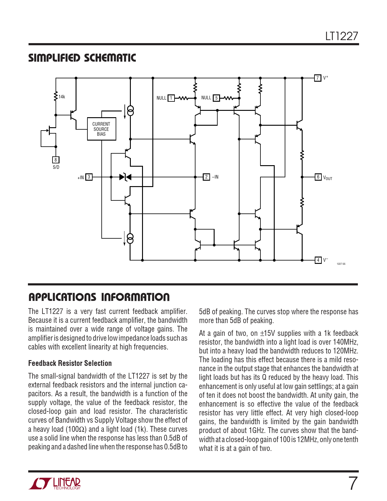 The LT1227 is a very fast current feedback amplifier. 5dB of peaking. The curves stop where the response has Because it is a current feedback amplifier, the bandwidth more than 5dB of peaking. is maintained over a wide range of voltage gains. The At a gain of two, on ±15V supplies with a 1k feedback amplifier is designed to drive low impedance loads such as resistor, the bandwidth into a light load is over 140MHz, cables with excellent linearity at high frequencies. but into a heavy load the bandwidth reduces to 120MHz. The loading has this effect because there is a mild reso-