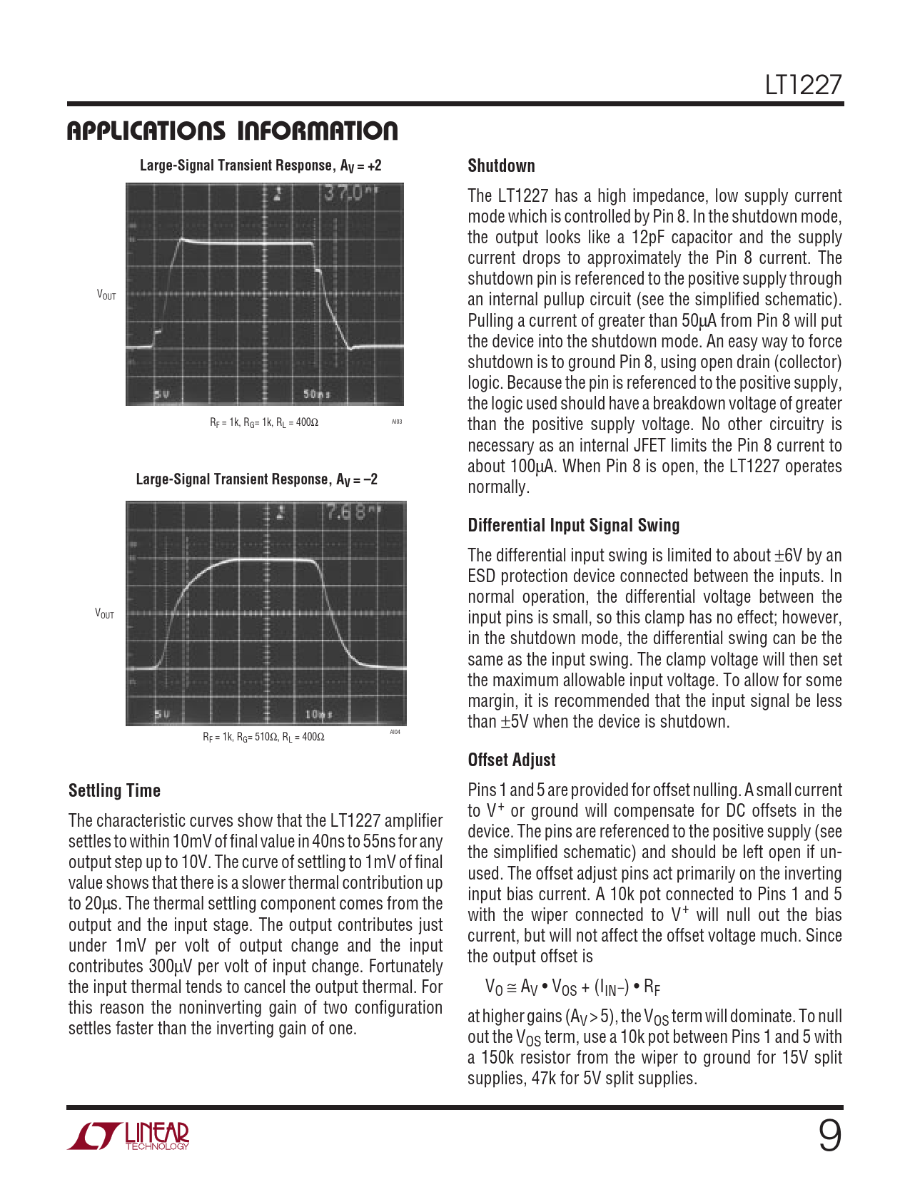 Pins 1 and 5 are provided for offset nulling. A small current to V+ or ground will compensate for DC offsets in the The characteristic curves show that the LT1227 amplifier device. The pins are referenced to the positive supply (see settles to within 10mV of final value in 40ns to 55ns for any the simplified schematic) and should be left open if un- output step up to 10V. The curve of settling to 1mV of final used. The offset adjust pins act primarily on the inverting value shows that there is a slower thermal contribution up input bias current. A 10k pot connected to Pins 1 and 5 to 20µs. The thermal settling component comes from the with the wiper connected to V+ will null out the bias output and the input stage. The output contributes just current, but will not affect the offset voltage much. Since under 1mV per volt of output change and the input the output offset is contributes 300µV per volt of input change. Fortunately the input thermal tends to cancel the output thermal. For VO ≅ AV • VOS + (IIN–) • RF this reason the noninverting gain of two configuration at higher gains (A settles faster than the inverting gain of one. V > 5), the VOS term will dominate. To null out the VOS term, use a 10k pot between Pins 1 and 5 with a 150k resistor from the wiper to ground for 15V split supplies, 47k for 5V split supplies. 9
