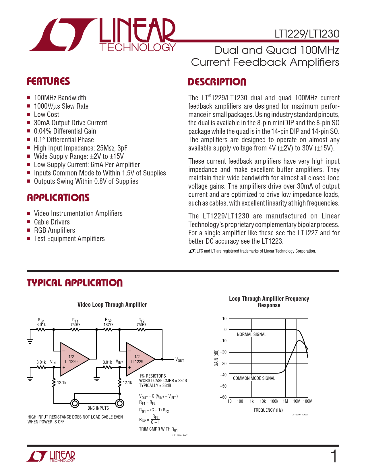 LT1229/LT1230 Dual and Quad 100MHz Current Feedback Amplifiers UFEATURESDESCRIPTIO ■ 100MHz Bandwidth The LT®1229/LT1230 dual and quad 100MHz current ■ 1000V/µs Slew Rate feedback amplifiers are designed for maximum perfor- ■ Low Cost mance in small packages. Using industry standard pinouts, ■ 30mA Output Drive Current the dual is available in the 8-pin miniDIP and the 8-pin SO ■ 0.04% Differential Gain package while the quad is in the 14-pin DIP and 14-pin SO. ■ 0.1° Differential Phase The amplifiers are designed to operate on almost any ■ High Input Impedance: 25MΩ, 3pF available supply voltage from 4V (±2V) to 30V (±15V). ■ Wide Supply Range: ±2V to ±15V These current feedback amplifiers have very high input ■ Low Supply Current: 6mA Per Amplifier impedance and make excellent buffer amplifiers. They ■ Inputs Common Mode to Within 1.5V of Supplies maintain their wide bandwidth for almost all closed-loop ■ Outputs Swing Within 0.8V of Supplies U voltage gains. The amplifiers drive over 30mA of output APPLICATIO S current and are optimized to drive low impedance loads, such as cables, with excellent linearity at high frequencies. ■ Video Instrumentation Amplifiers The LT1229/LT1230 are manufactured on Linear ■ Cable Drivers Technology’s proprietary complementary bipolar process. ■ RGB Amplifiers For a single amplifier like these see the LT1227 and for ■ Test Equipment Amplifiers better DC accuracy see the LT1223. , LTC and LT are registered trademarks of Linear Technology Corporation. UTYPICAL APPLICATIOLoop Through Amplifier FrequencyVideo Loop Through AmplifierResponse R R R R 10 G1 F1 G2 F2 3.01k 750Ω 187Ω 750Ω 0 NORMAL SIGNAL –10 – – –20 1/2 1/2 V V OUT 3.01k V LT1229 IN– 3.01k IN+ LT1229 –30 + + GAIN (dB) 1% RESISTORS –40 COMMON MODE SIGNAL 12.1k 12.1k WORST CASE CMRR = 22dB TYPICALLY = 38dB –50 VOUT = G (VIN+ – VIN–) –60 R 10 100 1k 10k 100k 1M 10M 100M F1 = RF2 BNC INPUTS RG1 = (G – 1) RF2 FREQUENCY (Hz) LT1229 • TA02 HIGH INPUT RESISTANCE DOES NOT LOAD CABLE EVEN RF2 RG2 = WHEN POWER IS OFF G – 1 TRIM CMRR WITH RG1 LT1229 • TA01 1