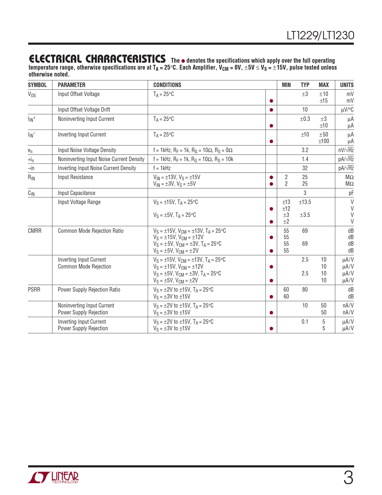 VOS Input Offset Voltage TA = 25°C ±3 ±10 mV ● ±15 mV Input Offset Voltage Drift ● 10 µV/°C I + IN Noninverting Input Current TA = 25°C ±0.3 ±3 µA ● ±10 µA I – IN Inverting Input Current TA = 25°C ±10 ±50 µA ● ±100 µA en Input Noise Voltage Density f = 1kHz, RF = 1k, RG = 10Ω, RS = 0Ω 3.2 nV/√Hz +in Noninverting Input Noise Current Density f = 1kHz, RF = 1k, RG = 10Ω, RS = 10k 1.4 pA/√Hz –in Inverting Input Noise Current Density f = 1kHz 32 pA/√Hz RIN Input Resistance VIN = ±13V, VS = ±15V ● 2 25 MΩ VIN = ±3V, VS = ±5V ● 2 25 MΩ CIN Input Capacitance 3 pF Input Voltage Range VS = ±15V, TA = 25°C ±13 ±13.5 V ● ±12 V VS = ±5V, TA = 25°C ±3 ±3.5 V ● ±2 V CMRR Common Mode Rejection Ratio VS = ±15V, VCM = ±13V, TA = 25°C 55 69 dB VS = ±15V, VCM = ±12V ● 55 dB VS = ±5V, VCM = ±3V, TA = 25°C 55 69 dB VS = ±5V, VCM = ±2V ● 55 dB Inverting Input Current VS = ±15V, VCM = ±13V, TA = 25°C 2.5 10 µA/V Common Mode Rejection VS = ±15V, VCM = ±12V ● 10 µA/V VS = ±5V, VCM = ±3V, TA = 25°C 2.5 10 µA/V VS = ±5V, VCM = ±2V ● 10 µA/V PSRR Power Supply Rejection Ratio VS = ±2V to ±15V, TA = 25°C 60 80 dB VS = ±3V to ±15V ● 60 dB Noninverting Input Current VS = ±2V to ±15V, TA = 25°C 10 50 nA/V Power Supply Rejection VS = ±3V to ±15V ● 50 nA/V Inverting Input Current VS = ±2V to ±15V, TA = 25°C 0.1 5 µA/V Power Supply Rejection VS = ±3V to ±15V ● 5 µA/V 3