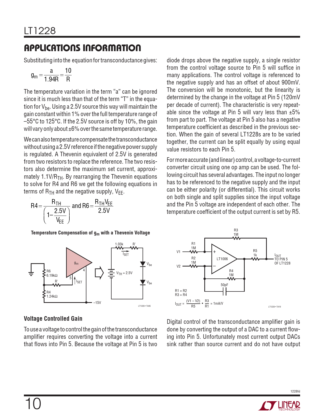 Digital control of the transconductance amplifier gain is To use a voltage to control the gain of the transconductance done by converting the output of a DAC to a current flow- amplifier requires converting the voltage into a current ing into Pin 5. Unfortunately most current output DACs that flows into Pin 5. Because the voltage at Pin 5 is two sink rather than source current and do not have output 1228fd 10 Document Outline Features Applications Description Typical Application Absolute Maximum Ratings Pin Configuration Order Information Electrical Characteristics Typical Performance Characteristics Simplified Schematic Applications Information Typical Applications Package Description Revision History Typical Applications Related Parts
