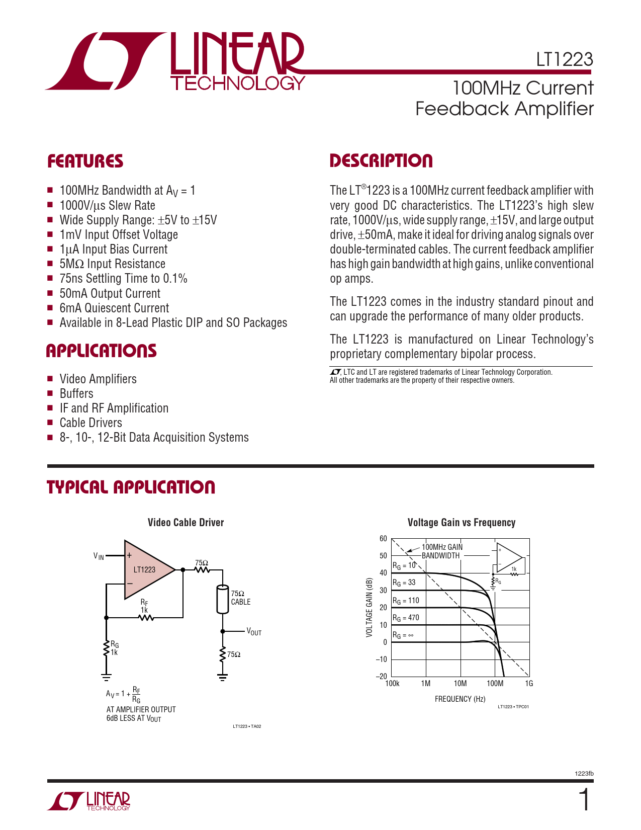 ■ 100MHz Bandwidth at AV = 1 The LT®1223 is a 100MHz current feedback amplifier with ■ 1000V/µs Slew Rate very good DC characteristics. The LT1223’s high slew ■ Wide Supply Range: ±5V to ±15V rate, 1000V/µs, wide supply range, ±15V, and large output ■ 1mV Input Offset Voltage drive, ±50mA, make it ideal for driving analog signals over ■ 1µA Input Bias Current double-terminated cables. The current feedback amplifier ■ 5MΩ Input Resistance has high gain bandwidth at high gains, unlike conventional ■ 75ns Settling Time to 0.1% op amps. ■ 50mA Output Current The LT1223 comes in the industry standard pinout and ■ 6mA Quiescent Current can upgrade the performance of many older products. ■ Available in 8-Lead Plastic DIP and SO Packages