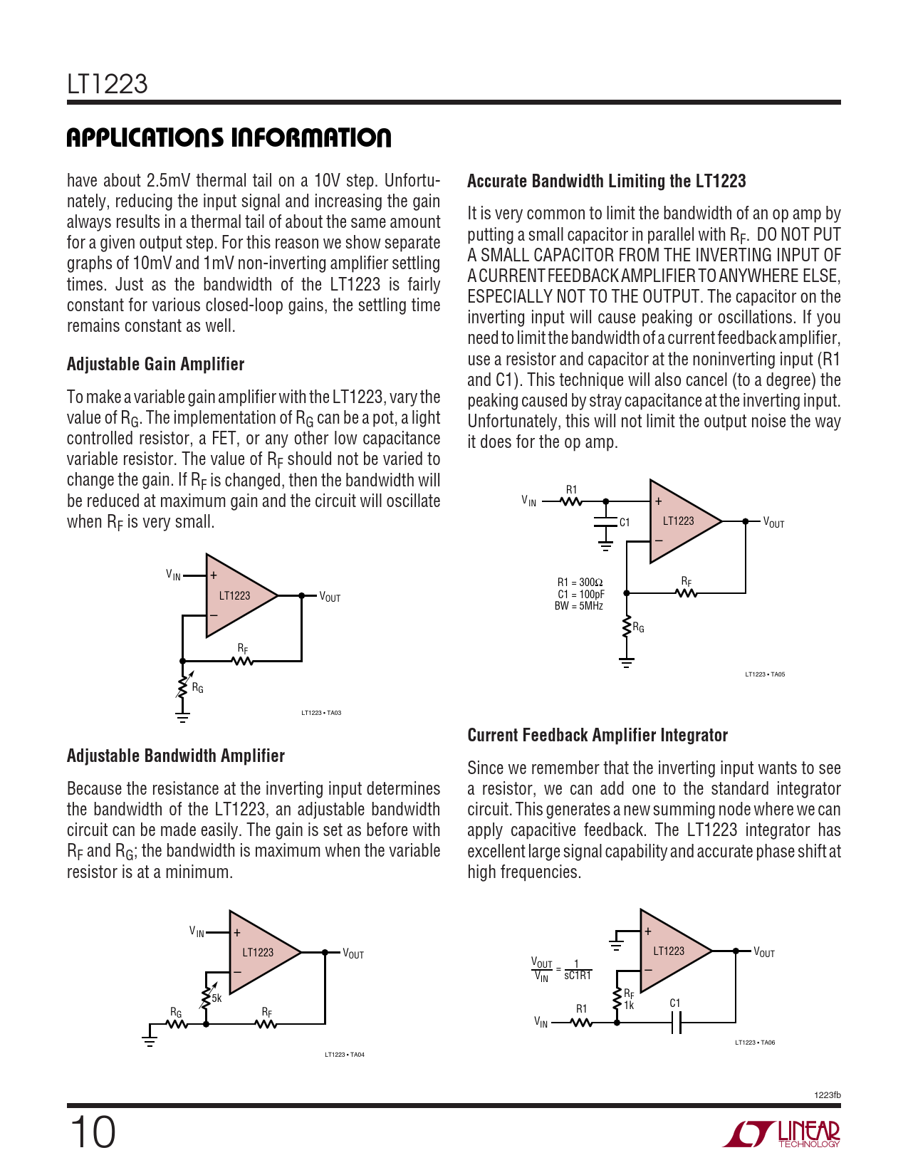 nately, reducing the input signal and increasing the gain always results in a thermal tail of about the same amount It is very common to limit the bandwidth of an op amp by for a given output step. For this reason we show separate putting a small capacitor in parallel with RF. DO NOT PUT graphs of 10mV and 1mV non-inverting amplifier settling A SMALL CAPACITOR FROM THE INVERTING INPUT OF times. Just as the bandwidth of the LT1223 is fairly A CURRENT FEEDBACK AMPLIFIER TO ANYWHERE ELSE, constant for various closed-loop gains, the settling time ESPECIALLY NOT TO THE OUTPUT. The capacitor on the remains constant as well. inverting input will cause peaking or oscillations. If you need to limit the bandwidth of a current feedback amplifier,