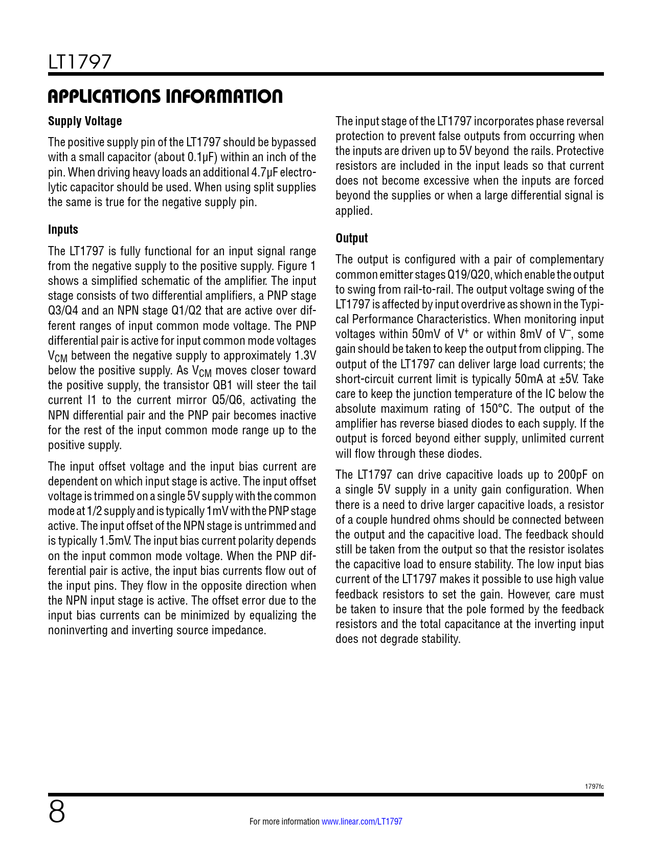 The input stage of the LT1797 incorporates phase reversal The positive supply pin of the LT1797 should be bypassed protection to prevent false outputs from occurring when with a small capacitor (about 0.1µF) within an inch of the the inputs are driven up to 5V beyond the rails. Protective pin. When driving heavy loads an additional 4.7µF electro- resistors are included in the input leads so that current lytic capacitor should be used. When using split supplies does not become excessive when the inputs are forced the same is true for the negative supply pin. beyond the supplies or when a large differential signal is applied.