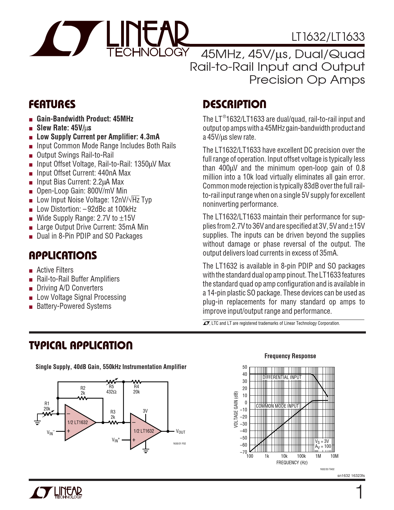 The LT1632 is available in 8-pin PDIP and SO packages ■ Active Filters with the standard dual op amp pinout. The LT1633 features ■ Rail-to-Rail Buffer Amplifiers the standard quad op amp configuration and is available in ■ Driving A/D Converters a 14-pin plastic SO package. These devices can be used as ■ Low Voltage Signal Processing plug-in replacements for many standard op amps to ■ Battery-Powered Systems improve input/output range and performance. , LTC and LT are registered trademarks of Linear Technology Corporation.