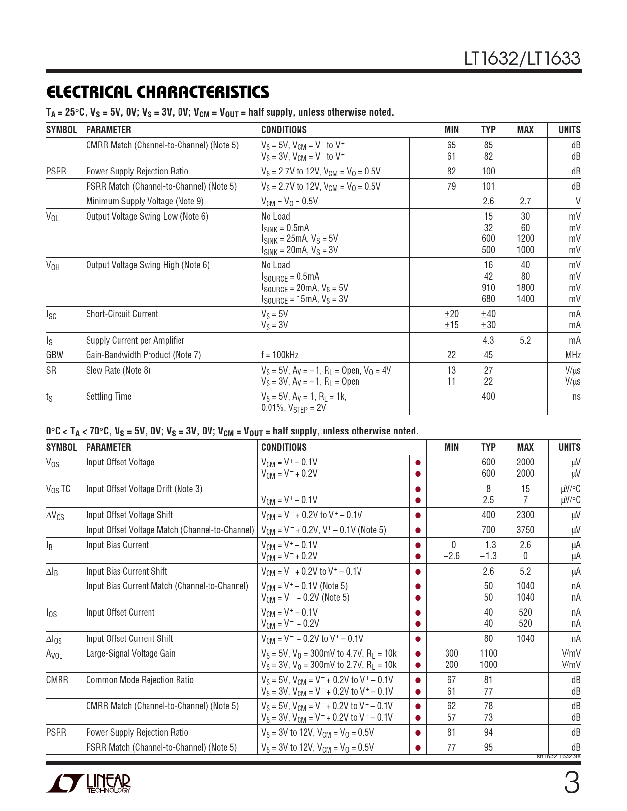 VOS Input Offset Voltage VCM = V+ – 0.1V ● 600 2000 µV VCM = V– + 0.2V ● 600 2000 µV VOS TC Input Offset Voltage Drift (Note 3) ● 8 15 µV/°C VCM = V+ – 0.1V ● 2.5 7 µV/°C ∆VOS Input Offset Voltage Shift VCM = V– + 0.2V to V+ – 0.1V ● 400 2300 µV Input Offset Voltage Match (Channel-to-Channel) VCM = V – + 0.2V, V+ – 0.1V (Note 5) ● 700 3750 µV IB Input Bias Current VCM = V+ – 0.1V ● 0 1.3 2.6 µA VCM = V– + 0.2V ● – 2.6 – 1.3 0 µA ∆IB Input Bias Current Shift VCM = V– + 0.2V to V+ – 0.1V ● 2.6 5.2 µA Input Bias Current Match (Channel-to-Channel) VCM = V+ – 0.1V (Note 5) ● 50 1040 nA VCM = V– + 0.2V (Note 5) ● 50 1040 nA IOS Input Offset Current VCM = V+ – 0.1V ● 40 520 nA VCM = V– + 0.2V ● 40 520 nA ∆IOS Input Offset Current Shift VCM = V– + 0.2V to V+ – 0.1V ● 80 1040 nA AVOL Large-Signal Voltage Gain VS = 5V, VO = 300mV to 4.7V, RL = 10k ● 300 1100 V/mV VS = 3V, VO = 300mV to 2.7V, RL = 10k ● 200 1000 V/mV CMRR Common Mode Rejection Ratio VS = 5V, VCM = V– + 0.2V to V+ – 0.1V ● 67 81 dB VS = 3V, VCM = V– + 0.2V to V+ – 0.1V ● 61 77 dB CMRR Match (Channel-to-Channel) (Note 5) VS = 5V, VCM = V– + 0.2V to V+ – 0.1V ● 62 78 dB VS = 3V, VCM = V– + 0.2V to V+ – 0.1V ● 57 73 dB PSRR Power Supply Rejection Ratio VS = 3V to 12V, VCM = VO = 0.5V ● 81 94 dB PSRR Match (Channel-to-Channel) (Note 5) VS = 3V to 12V, VCM = VO = 0.5V ● 77 95 dB sn1632 16323fs 3