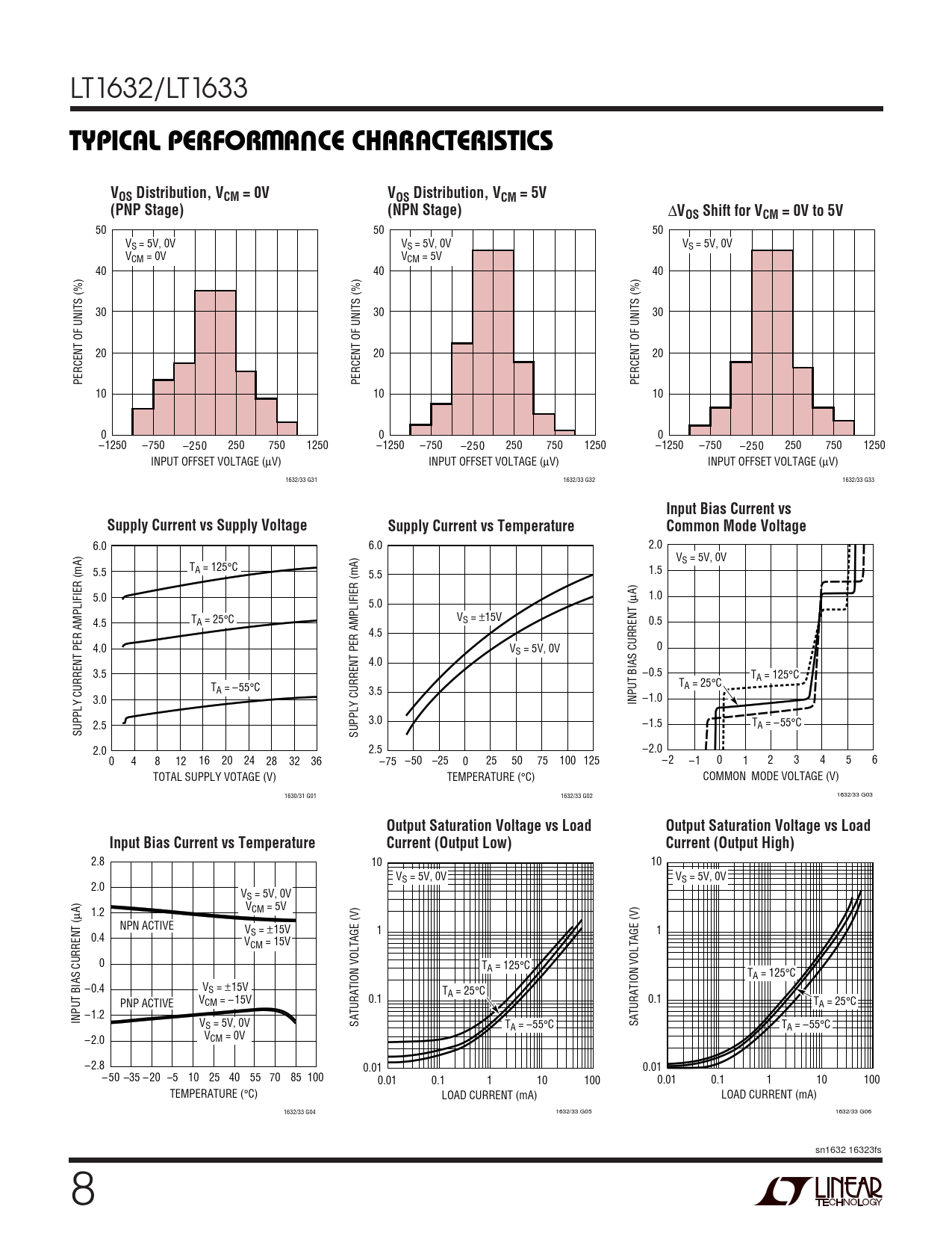 50 50 50 VS = 5V, 0V VS = 5V, 0V VS = 5V, 0V VCM = 0V VCM = 5V 40 40 40 30 30 30 20 20 20 PERCENT OF UNITS (%) PERCENT OF UNITS (%) PERCENT OF UNITS (%) 10 10 10 0 0 0 –1250 –750 –250 250 750 1250 –1250 –750 –250 250 750 1250 –1250 –750 –250 250 750 1250 INPUT OFFSET VOLTAGE (µV) INPUT OFFSET VOLTAGE (µV) INPUT OFFSET VOLTAGE (µV) 1632/33 G31 1632/33 G32 1632/33 G33