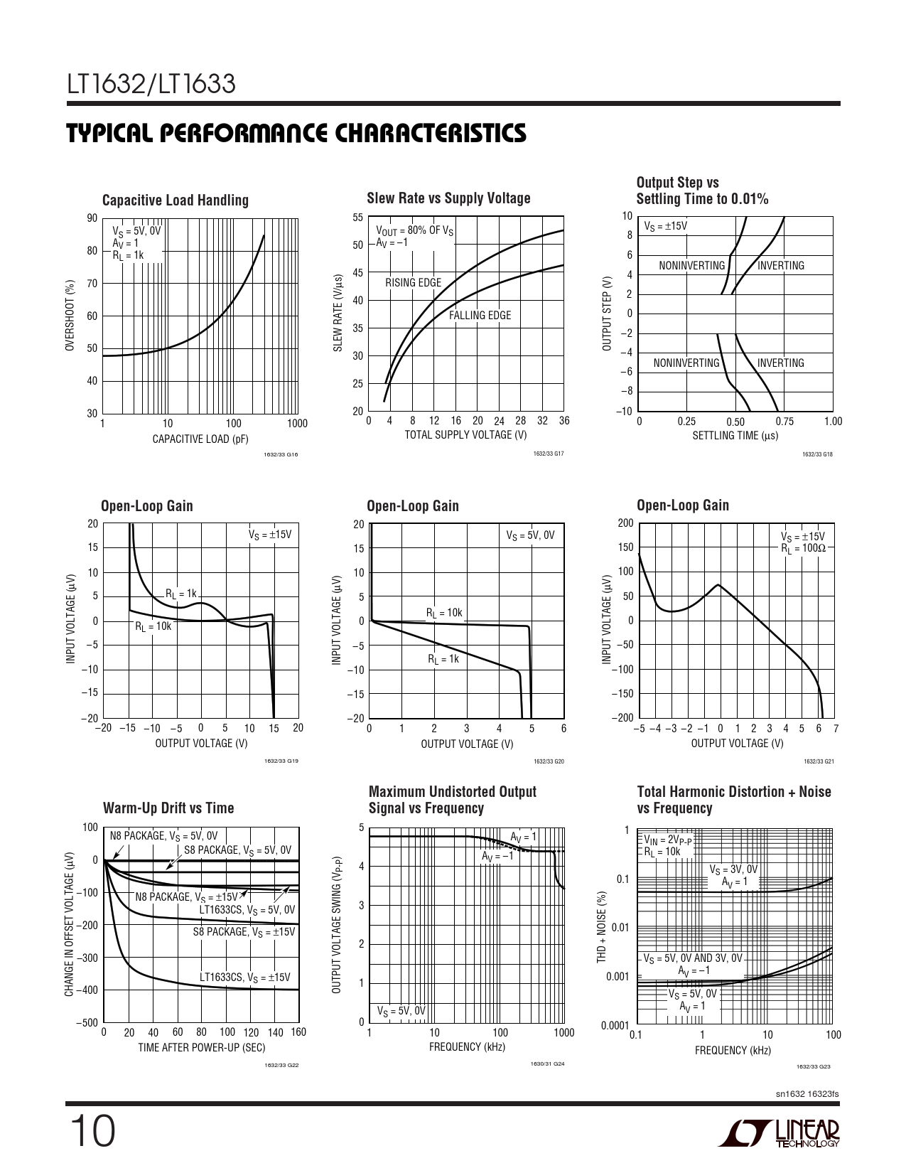 100 5 1 N8 PACKAGE, VS = 5V, 0V AV = 1 VIN = 2VP-P S8 PACKAGE, VS = 5V, 0V RL = 10k ) µV) 0 AV = –1 P-P 4 VS = 3V, 0V 0.1 AV = 1 –100 N8 PACKAGE, VS = ±15V LT1633CS, V 3 S = 5V, 0V –200 S8 PACKAGE, V 0.01 S = ±15V 2 –300 THD + NOISE (%) VS = 5V, 0V AND 3V, 0V A LT1633CS, V V = –1 S = ±15V 0.001 1 CHANGE IN OFFSET VOLTAGE ( –400 OUTPUT VOLTAGE SWING (V VS = 5V, 0V A V V = 1 S = 5V, 0V –500 0 0.0001 0 20 40 60 80 100 120 140 160 1 10 100 1000 0.1 1 10 100 TIME AFTER POWER-UP (SEC) FREQUENCY (kHz) FREQUENCY (kHz) 1632/33 G22 1630/31 G24 1632/33 G23 sn1632 16323fs 10