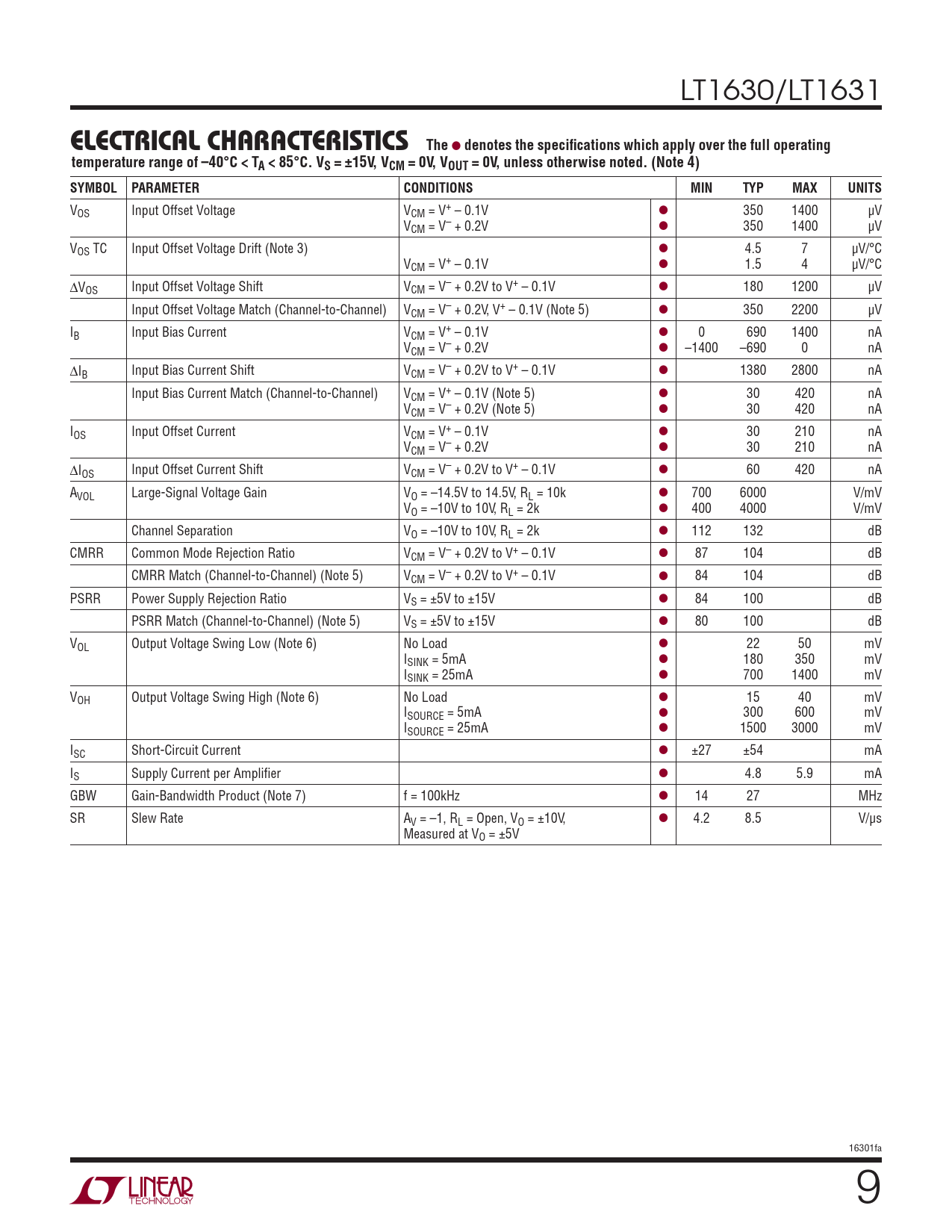 denotes the specifications which apply over the full operating temperature range of –40°C < TA < 85°C. VS = ±15V, VCM = 0V, VOUT = 0V, unless otherwise noted. (Note 4) SYMBOL PARAMETER CONDITIONS MIN TYP MAX UNITS