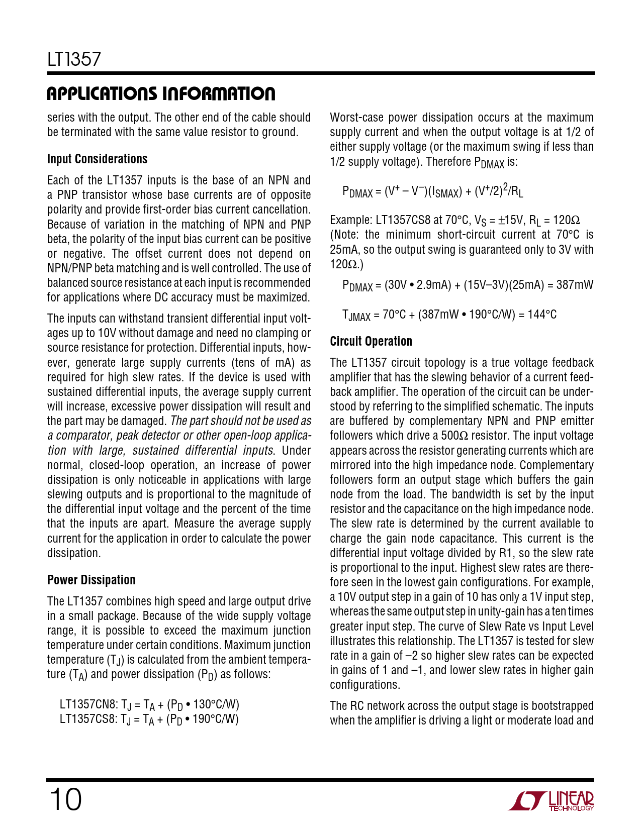 source resistance for protection. Differential inputs, how- ever, generate large supply currents (tens of mA) as The LT1357 circuit topology is a true voltage feedback required for high slew rates. If the device is used with amplifier that has the slewing behavior of a current feed- sustained differential inputs, the average supply current back amplifier. The operation of the circuit can be under- will increase, excessive power dissipation will result and stood by referring to the simplified schematic. The inputs the part may be damaged. The part should not be used as are buffered by complementary NPN and PNP emitter a comparator, peak detector or other open-loop applica- followers which drive a 500Ω resistor. The input voltage tion with large, sustained differential inputs. Under appears across the resistor generating currents which are normal, closed-loop operation, an increase of power mirrored into the high impedance node. Complementary dissipation is only noticeable in applications with large followers form an output stage which buffers the gain slewing outputs and is proportional to the magnitude of node from the load. The bandwidth is set by the input the differential input voltage and the percent of the time resistor and the capacitance on the high impedance node. that the inputs are apart. Measure the average supply The slew rate is determined by the current available to current for the application in order to calculate the power charge the gain node capacitance. This current is the dissipation. differential input voltage divided by R1, so the slew rate is proportional to the input. Highest slew rates are there-