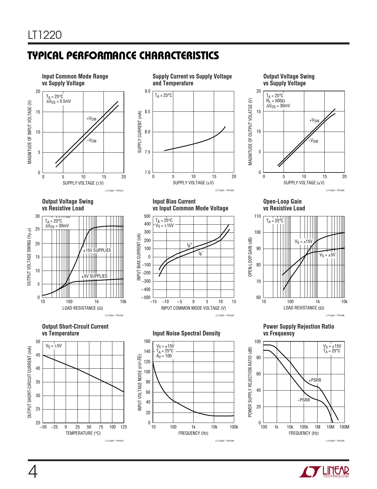 20 9.0 20 T TA = 25°C T A = 25°C A = 25°C ∆V R OS = 0.5mV L = 500Ω ∆VOS = 30mV 15 8.5 15 +VCM +VSW 10 8.0 10 –VCM –VSW 5 SUPPLY CURRENT (mA) 7.5 5 MAGNITUDE OF INPUT VOLTAGE (V) MAGNITUDE OF OUTPUT VOLATGE (V) 0 7.0 0 0 5 10 15 20 0 5 10 15 20 0 5 10 15 20 SUPPLY VOLTAGE (±V) SUPPLY VOLTAGE (±V) SUPPLY VOLTAGE (±V) LT1220 • TPC01 LT1220 • TPC02 LT1220 • TPC03