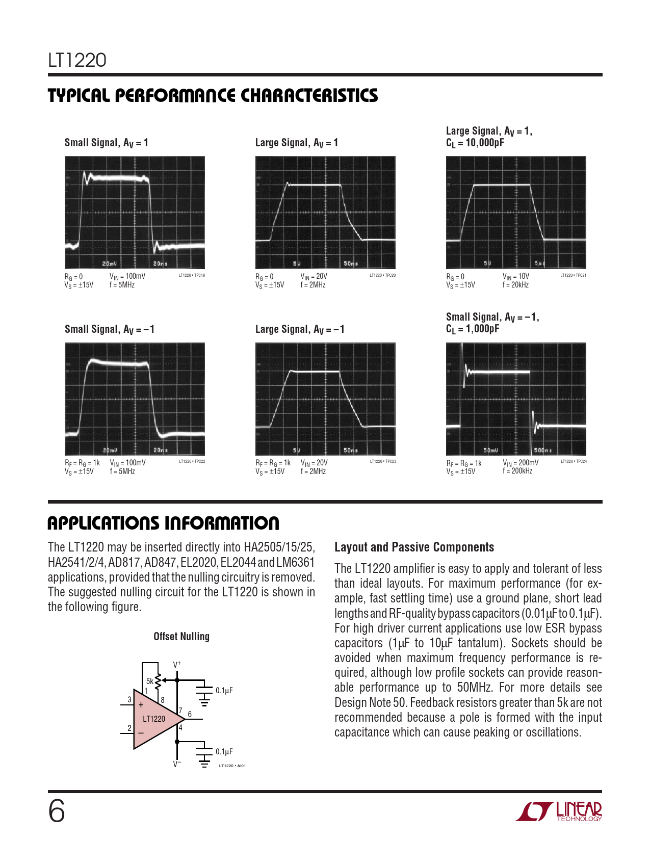 LT1220 WUTYPICAL PERFORMANCE CHARACTERISTICSLarge Signal, AV = 1,Small Signal, ALarge Signal, AV = 1V = 1CL = 10,000pF R LT1220 • TPC19 LT1220 • TPC20 LT1220 • TPC21 G = 0 VIN = 100mV RG = 0 VIN = 20V R V G = 0 IN = 10V VS = ±15V f = 5MHz VS = ±15V f = 2MHz V f = 20kHz S = ±15V Small Signal, AV = – 1,Small Signal, AV = – 1Large Signal, AV = – 1CL = 1,000pF R LT1220 • TPC22 LT1220 • TPC23 LT1220 • TPC24 F = RG = 1k VIN = 100mV RF = RG = 1k VIN = 20V R V F = RG = 1k IN = 200mV VS = ±15V f = 5MHz VS = ±15V f = 2MHz V f = 200kHz S = ±15V UUWUAPPLICATIONS INFORMATION The LT1220 may be inserted directly into HA2505/15/25, Layout and Passive Components HA2541/2/4, AD817, AD847, EL2020, EL2044 and LM6361 The LT1220 amplifier is easy to apply and tolerant of less applications, provided that the nulling circuitry is removed. than ideal layouts. For maximum performance (for ex- The suggested nulling circuit for the LT1220 is shown in ample, fast settling time) use a ground plane, short lead the following figure. lengths and RF-quality bypass capacitors (0.01µF to 0.1µF). For high driver current applications use low ESR bypass Offset Nulling capacitors (1µF to 10µF tantalum). Sockets should be avoided when maximum frequency performance is re- V+ quired, although low profile sockets can provide reason- 5k 1 0.1µF able performance up to 50MHz. For more details see 3 8 + Design Note 50. Feedback resistors greater than 5k are not 7 6 LT1220 recommended because a pole is formed with the input 2 4 – capacitance which can cause peaking or oscillations. 0.1µF V– LT1220 • AI01 6