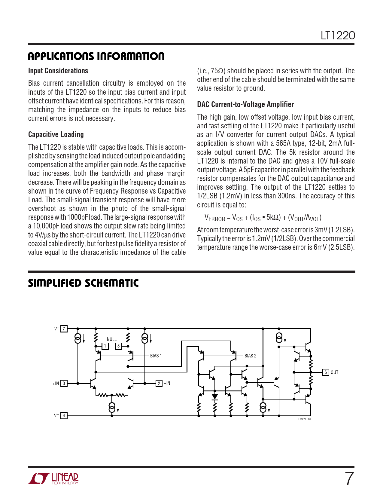 (i.e., 75Ω) should be placed in series with the output. The other end of the cable should be terminated with the same Bias current cancellation circuitry is employed on the value resistor to ground. inputs of the LT1220 so the input bias current and input offset current have identical specifications. For this reason,