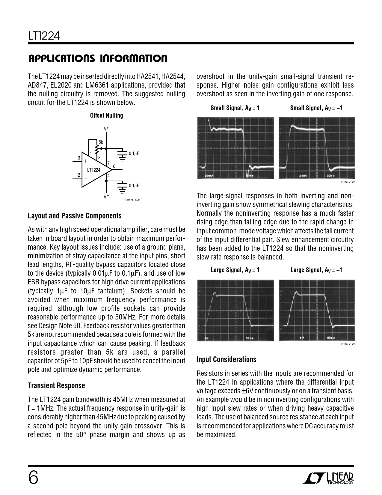 The LT1224 may be inserted directly into HA2541, HA2544, overshoot in the unity-gain small-signal transient re- AD847, EL2020 and LM6361 applications, provided that sponse. Higher noise gain configurations exhibit less the nulling circuitry is removed. The suggested nulling overshoot as seen in the inverting gain of one response. circuit for the LT1224 is shown below.
