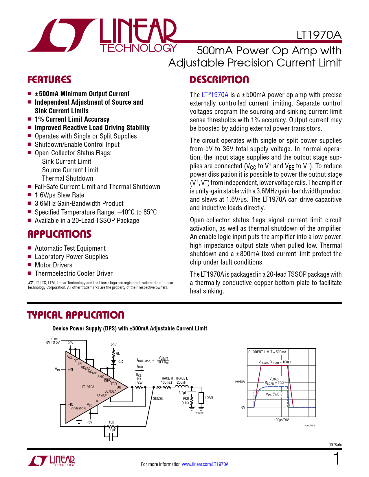 LT1970A 500mA Power Op Amp with Adjustable Precision Current Limit FeaTuresDescripTion n ± 500mA Minimum Output Current The LT®1970A is a ±500mA power op amp with precise n Independent Adjustment of Source and externally controlled current limiting. Separate control Sink Current Limits voltages program the sourcing and sinking current limit n 1% Current Limit Accuracy sense thresholds with 1% accuracy. Output current may n Improved Reactive Load Driving Stability be boosted by adding external power transistors. n Operates with Single or Split Supplies The circuit operates with single or split power supplies n Shutdown/Enable Control Input from 5V to 36V total supply voltage. In normal opera- n Open-Collector Status Flags: tion, the input stage supplies and the output stage sup- Sink Current Limit plies are connected (VCC to V+ and VEE to V–). To reduce Source Current Limit power dissipation it is possible to power the output stage Thermal Shutdown (V+, V–) from independent, lower voltage rails. The amplifier n Fail-Safe Current Limit and Thermal Shutdown is unity-gain stable with a 3.6MHz gain-bandwidth product n 1.6V/µs Slew Rate and slews at 1.6V/µs. The LT1970A can drive capacitive n 3.6MHz Gain-Bandwidth Product and inductive loads directly. n Specified Temperature Range: –40°C to 85°C n Available in a 20-Lead TSSOP Package Open-collector status flags signal current limit circuit activation, as well as thermal shutdown of the amplifier. applicaTions An enable logic input puts the amplifier into a low power, n high impedance output state when pulled low. Thermal Automatic Test Equipment n shutdown and a ±800mA fixed current limit protect the Laboratory Power Supplies n chip under fault conditions. Motor Drivers n Thermoelectric Cooler Driver The LT1970A is packaged in a 20-lead TSSOP package with L, LT, LTC, LTM, Linear Technology and the Linear logo are registered trademarks of Linear a thermally conductive copper bottom plate to facilitate Technology Corporation. All other trademarks are the property of their respective owners. heat sinking. Typical applicaTionDevice Power Supply (DPS) with ±500mA Adjustable Current Limit VLIMIT 0V TO 5V 20V 20V CURRENT LIMIT = 500mA 6k VCC V V+ LIMIT IOUT(MAX) = ±10 • R V CS LOAD, RLOAD = 100Ω ENVC I VIN +IN SRC OUT VCSNKISNK RCS 1Ω TRACE R TRACE L VLOAD, ISRC 1/4W 100mΩ 200nH 2V/DIV R TSD LOAD = 10Ω LT1970A OUT SENSE+ 4.7µF VIN, 5V/DIV SENSE– SENSE LOAD ESR V– –IN V 0.1Ω EE 0V COMMON 1970A TA01 100µs/DIV –5V 10k 1970A TA01b 100pF 1970afc For more information www.linear.com/LT1970A 1 Document Outline Features Applications Description Typical Application Absolute Maximum Ratings Pin Configuration Order Information Electrical Characteristics Typical Performance Characteristics Pin Functions Block Diagram And Test Circuit Applications Information Package Description Applications Information Related Parts