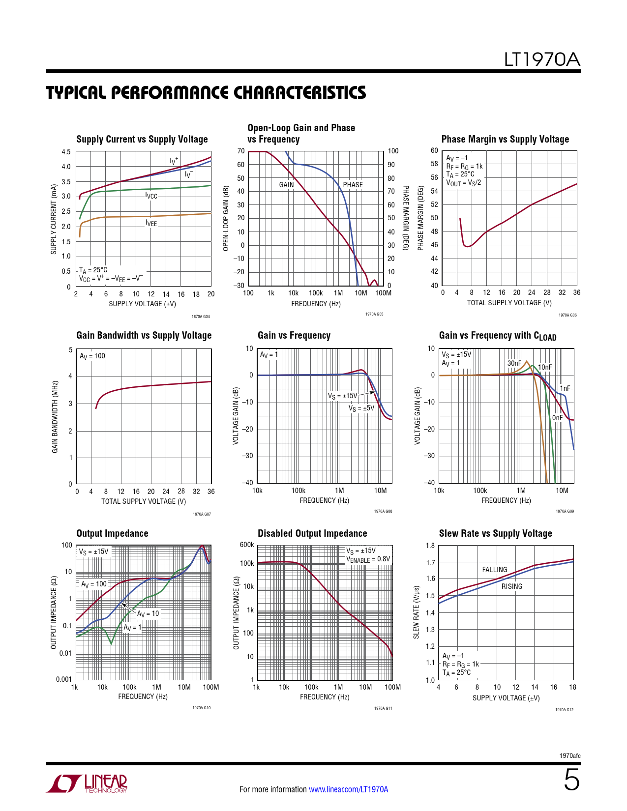 5 10 10 AV = 100 AV = 1 VS = ±15V AV = 1 30nF 10nF 4 0 0 1nF VS = ±15V 3 –10 –10 VS = ±5V 0nF 2 –20 –20 VOLTAGE GAIN (dB) VOLTAGE GAIN (dB) GAIN BANDWIDTH (MHz) 1 –30 –30 0 –40 –40 0 4 8 12 16 20 24 28 32 36 10k 100k 1M 10M 10k 100k 1M 10M TOTAL SUPPLY VOLTAGE (V) FREQUENCY (Hz) FREQUENCY (Hz) 1970A G08 1970A G09 1970A G07